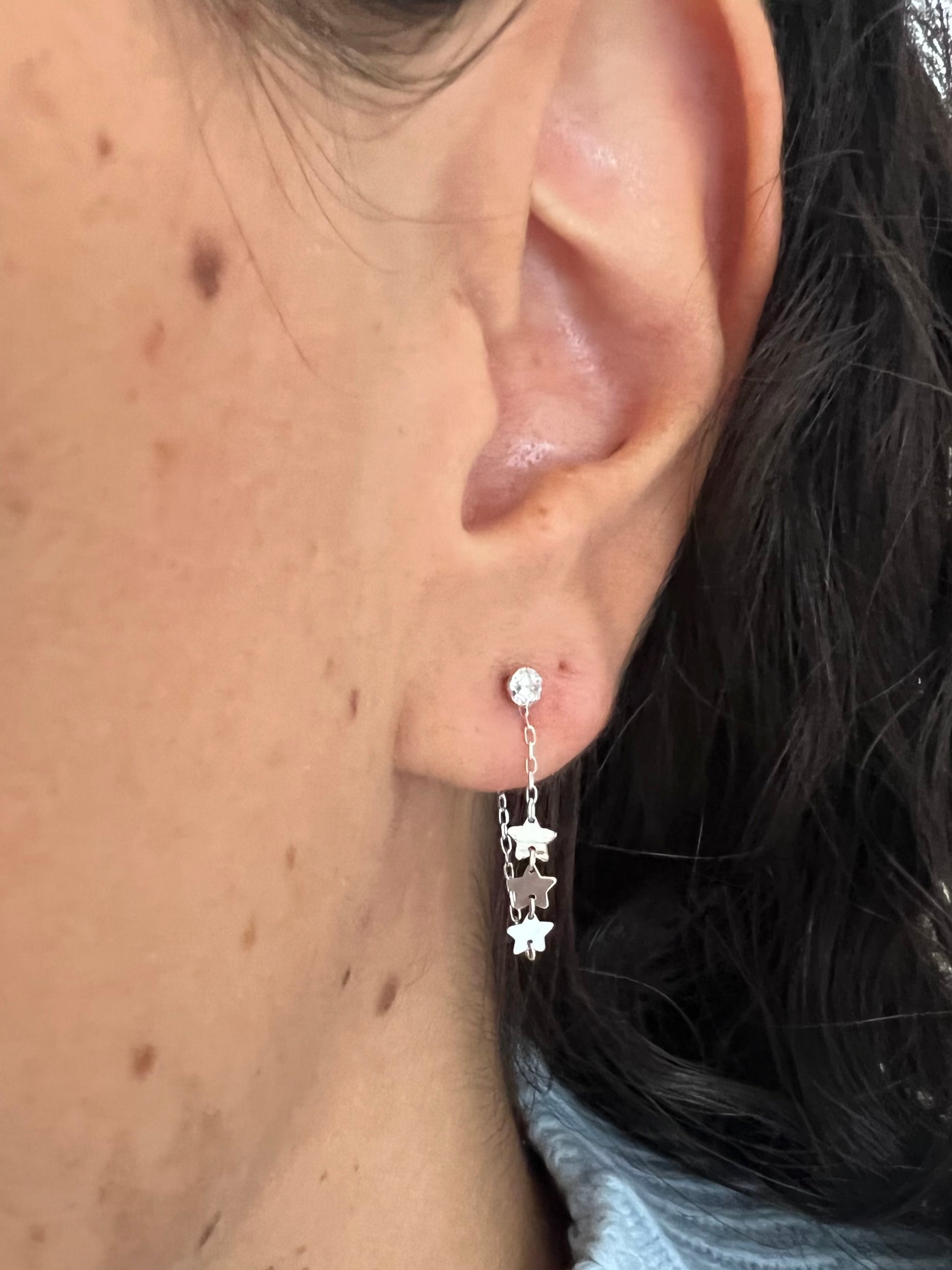 Arete en oro de 14k con zirconia y cadena con Estrellas colgantes. Viene un solo arete.