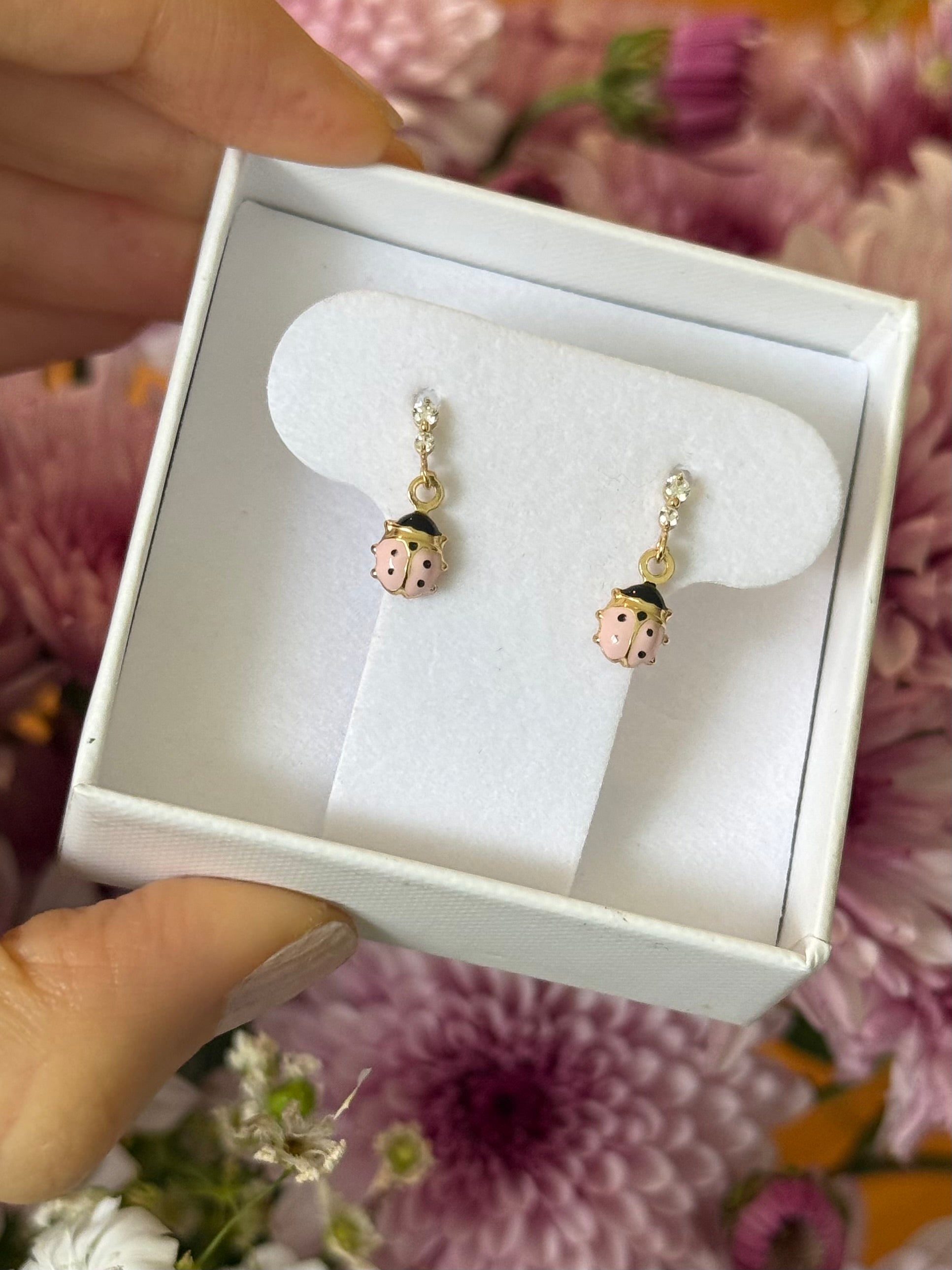 Broqueles en oro de 14k con 2 zirconias y una Catarina rosa pastel colgante