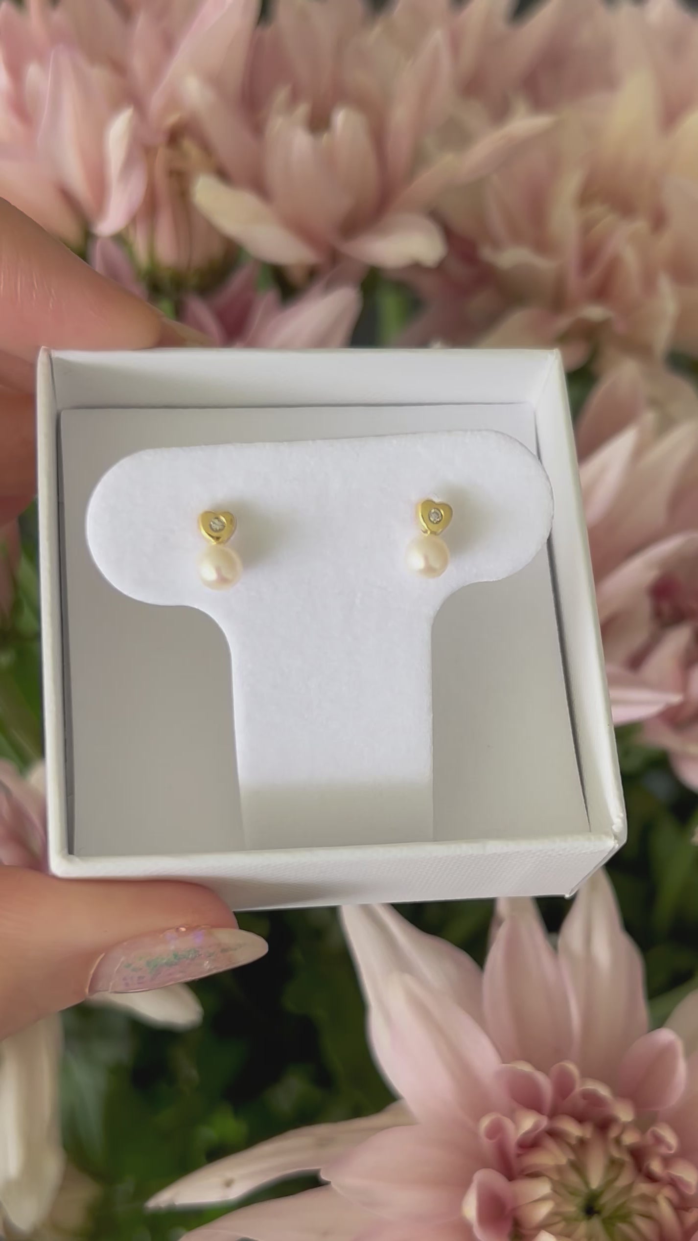 Broqueles en oro de 18k de corazón con diamante al centro y perla natural cultivada
