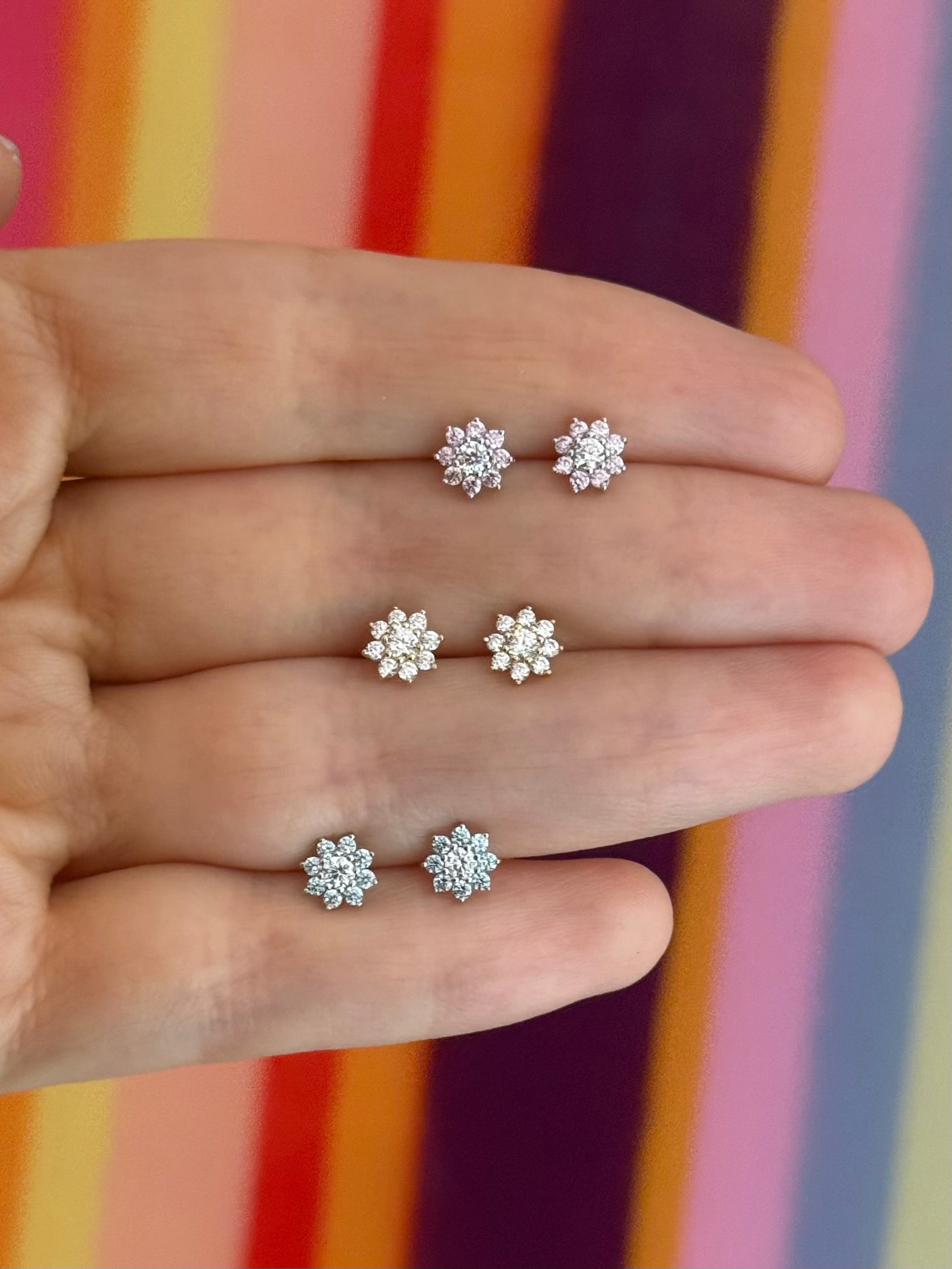 Broqueles en oro blanco de 14k de flor con 8 pétalos de zirconias rosas y al centro blanca