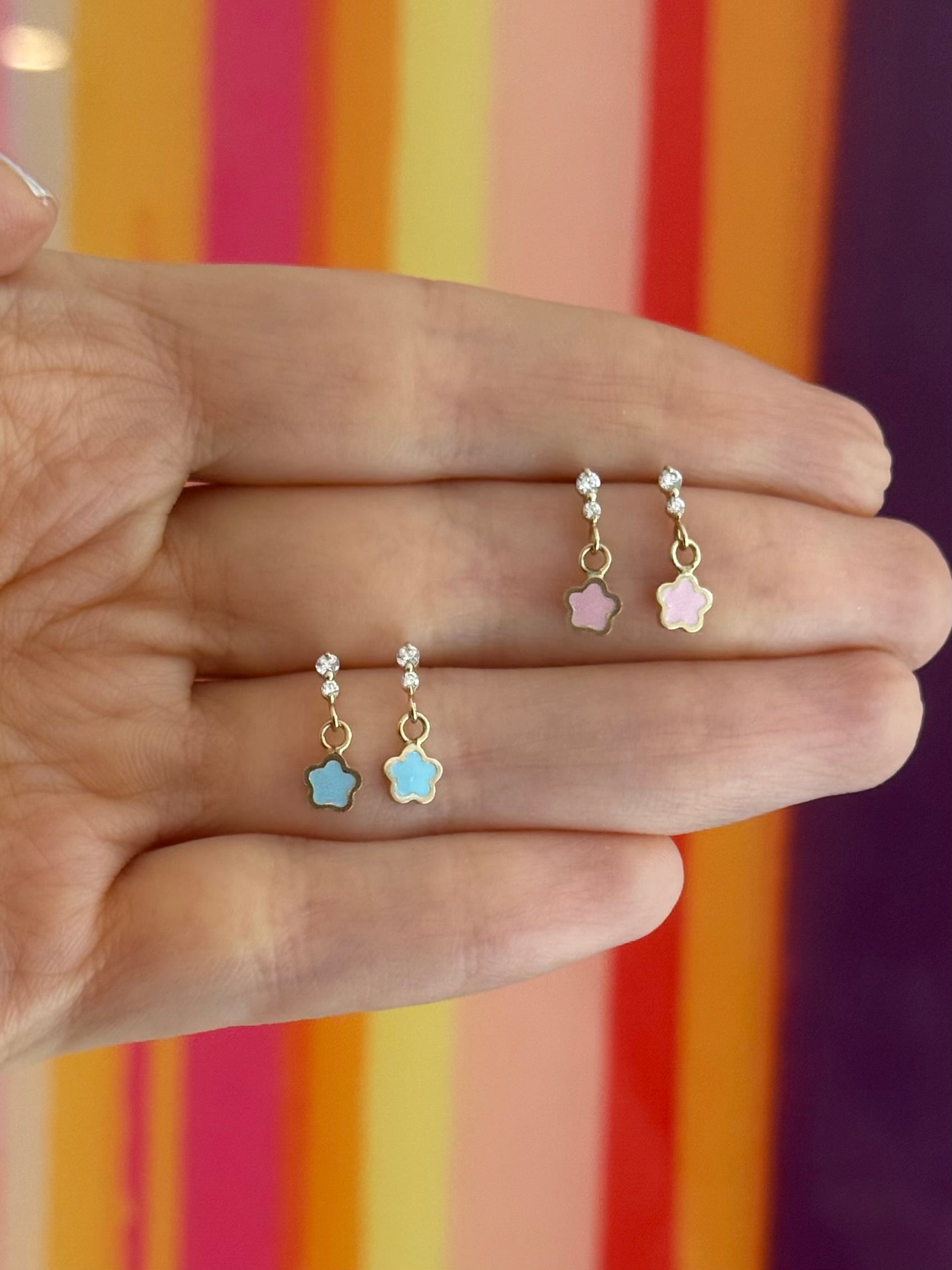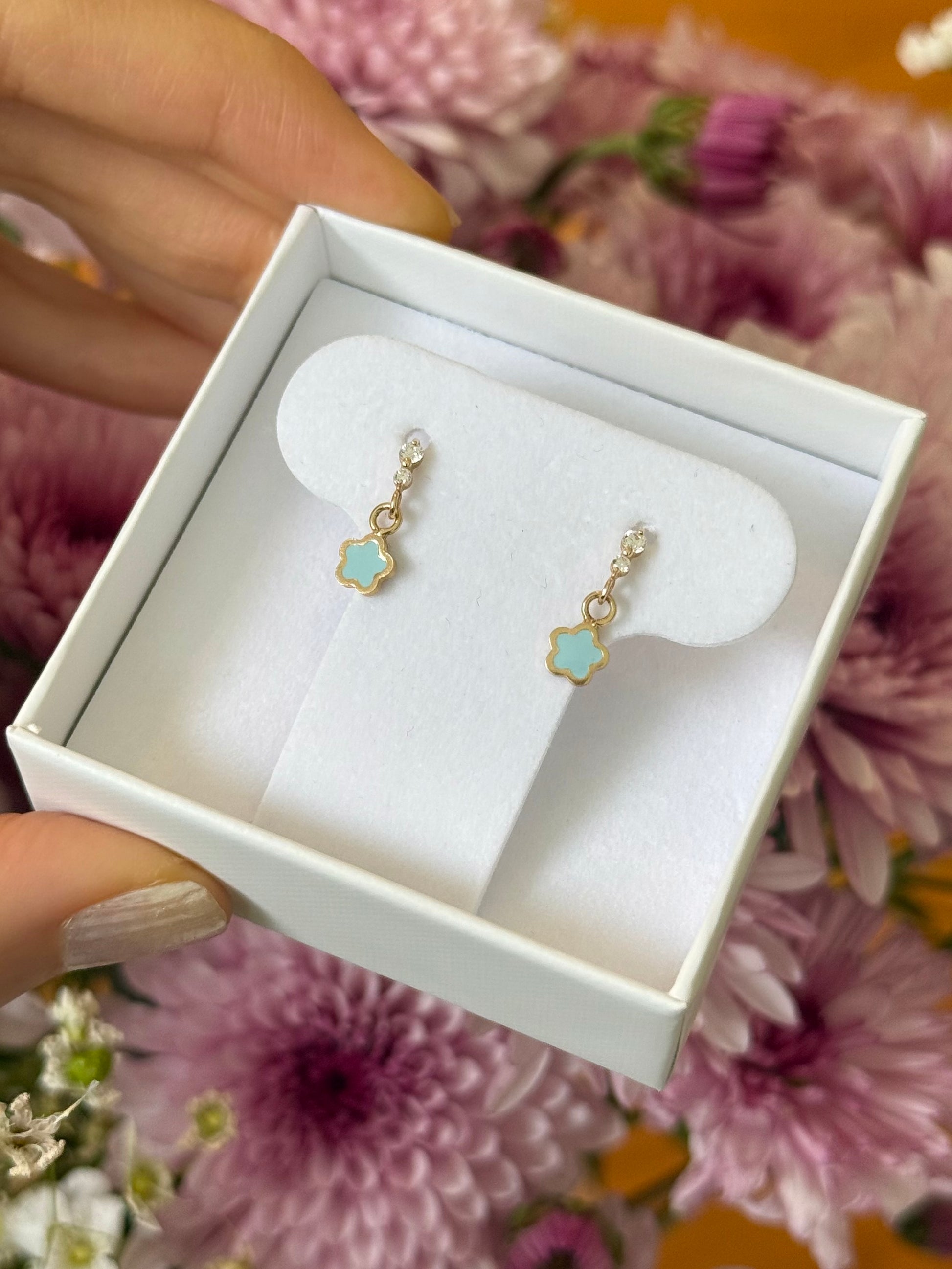 Broqueles en oro de 14k con dos zirconias y una flor esmaltada azul claro colgante