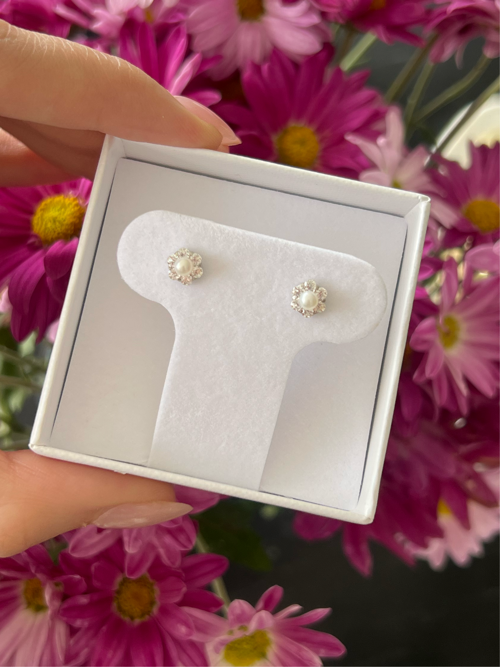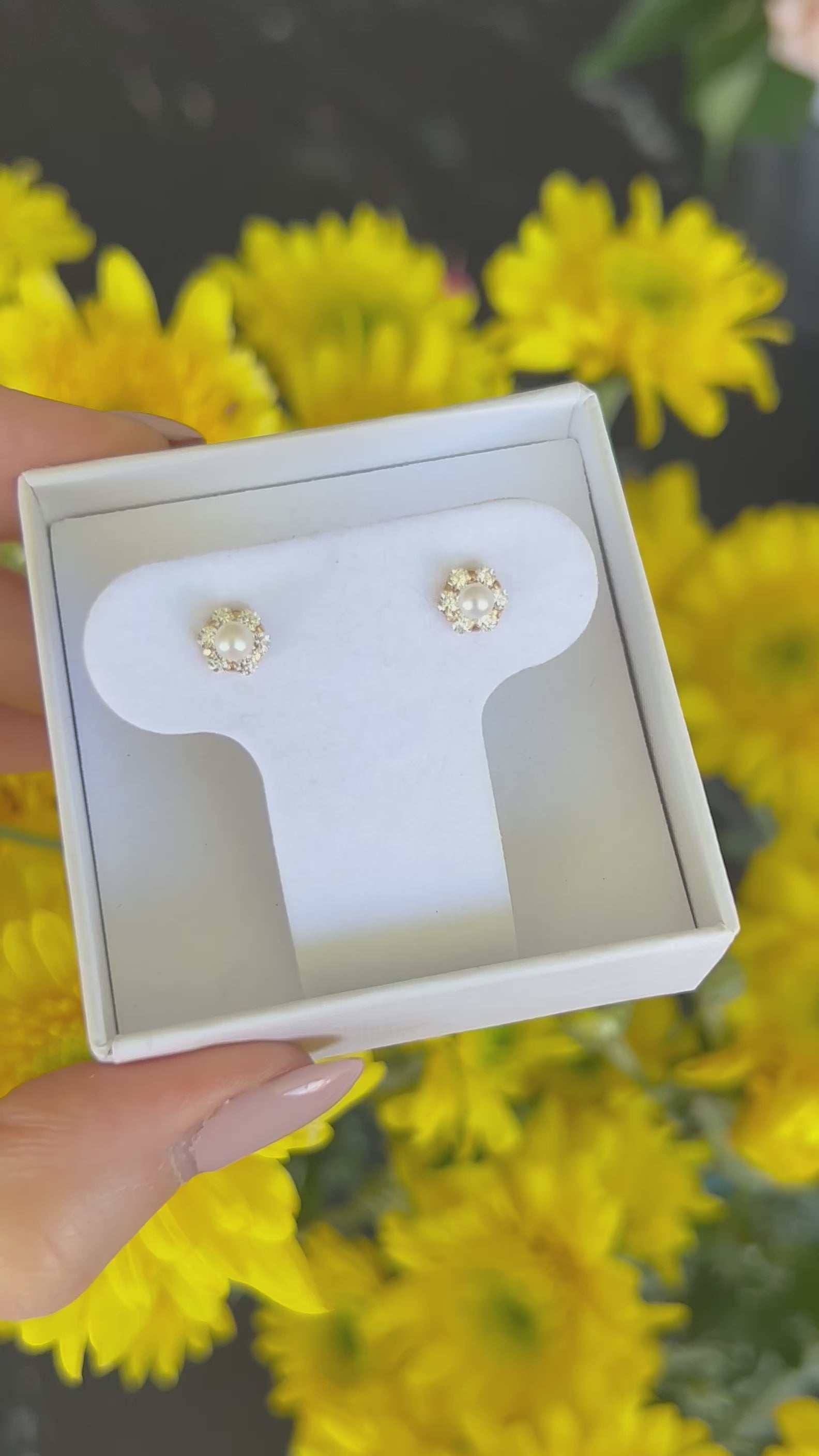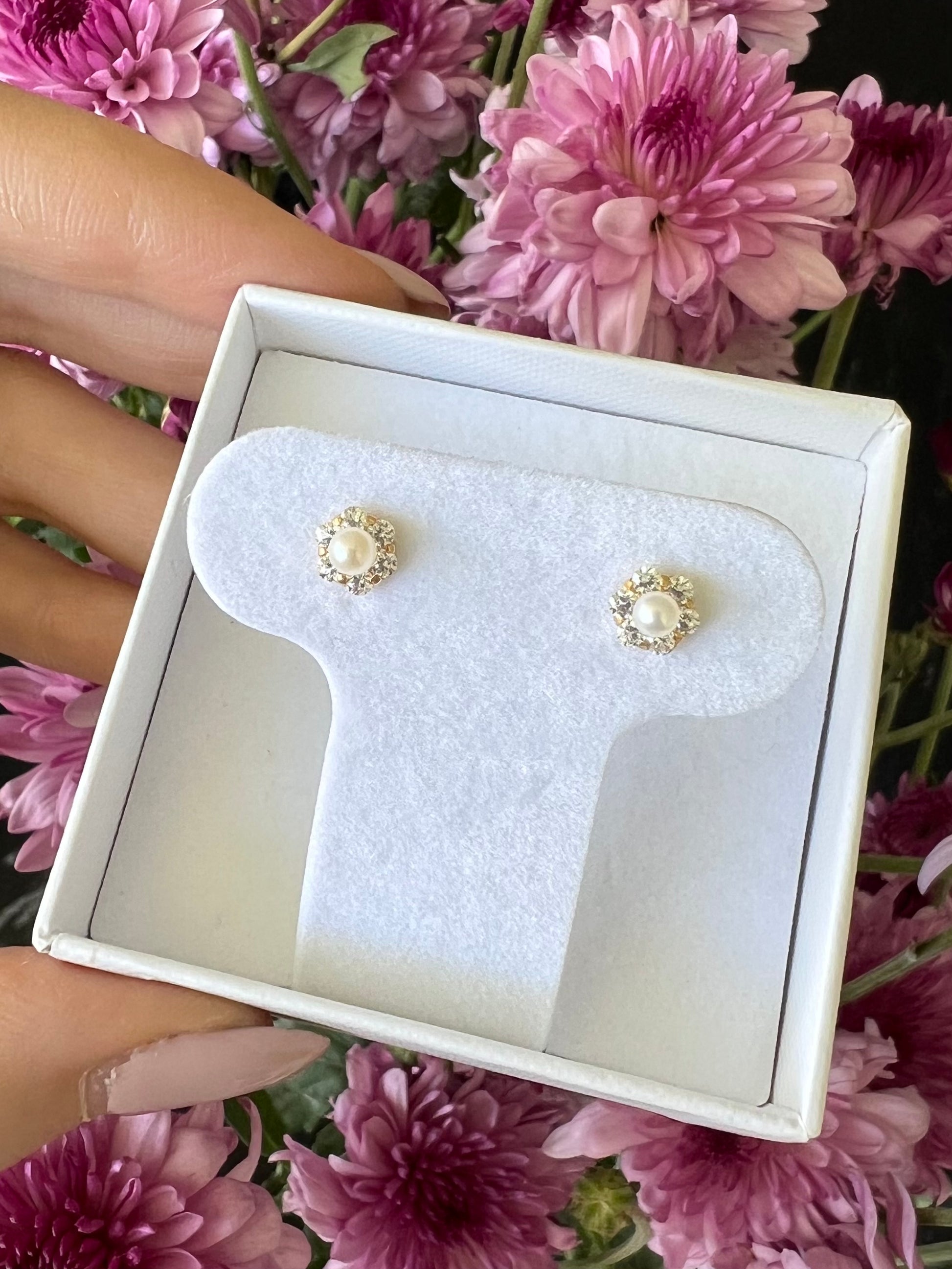 Broqueles en oro de 14k con perla natural cultivada y halo de flor de zirconias