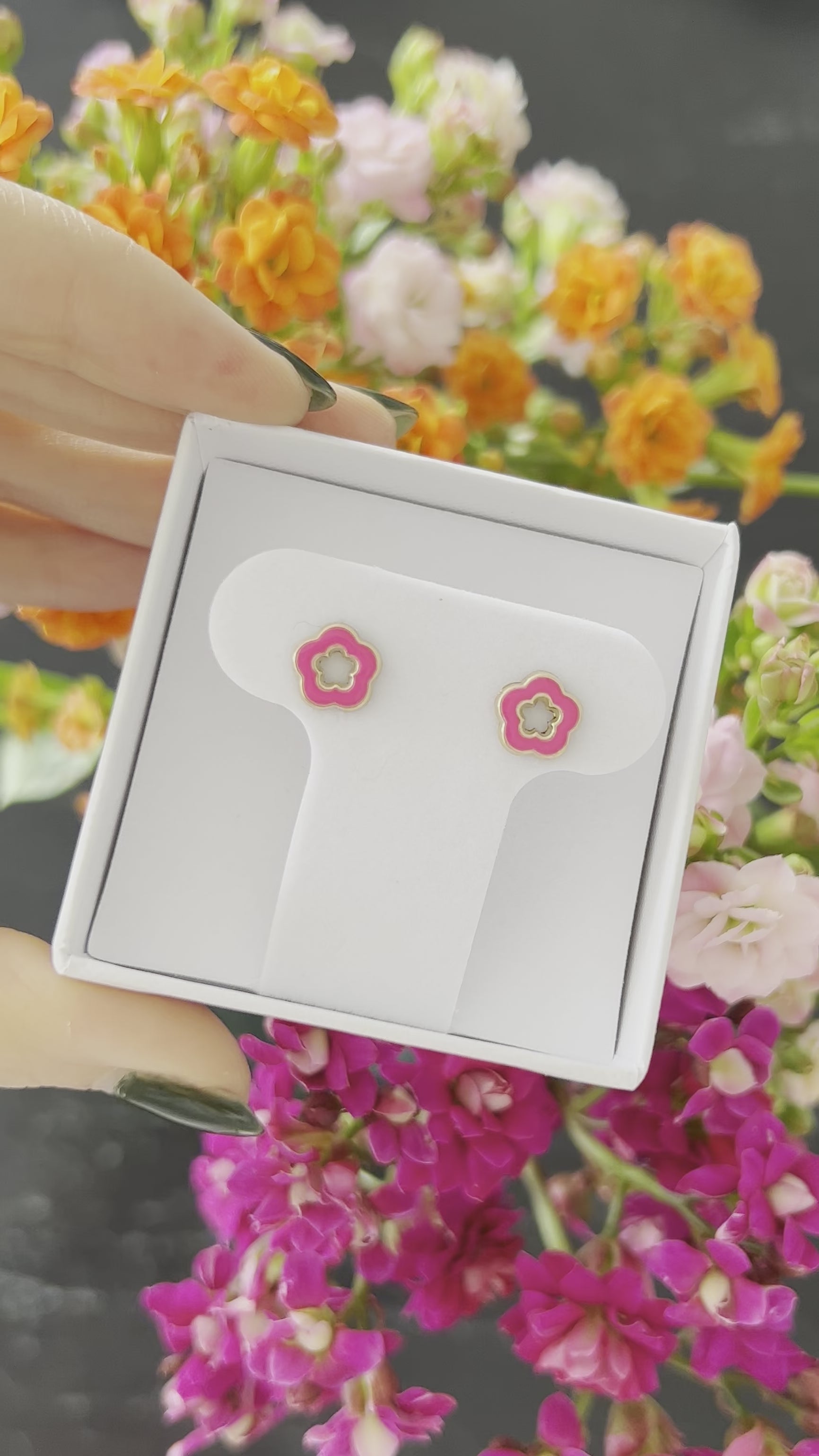 Aretes en oro de 14k de flor con esmalte rosa barbie