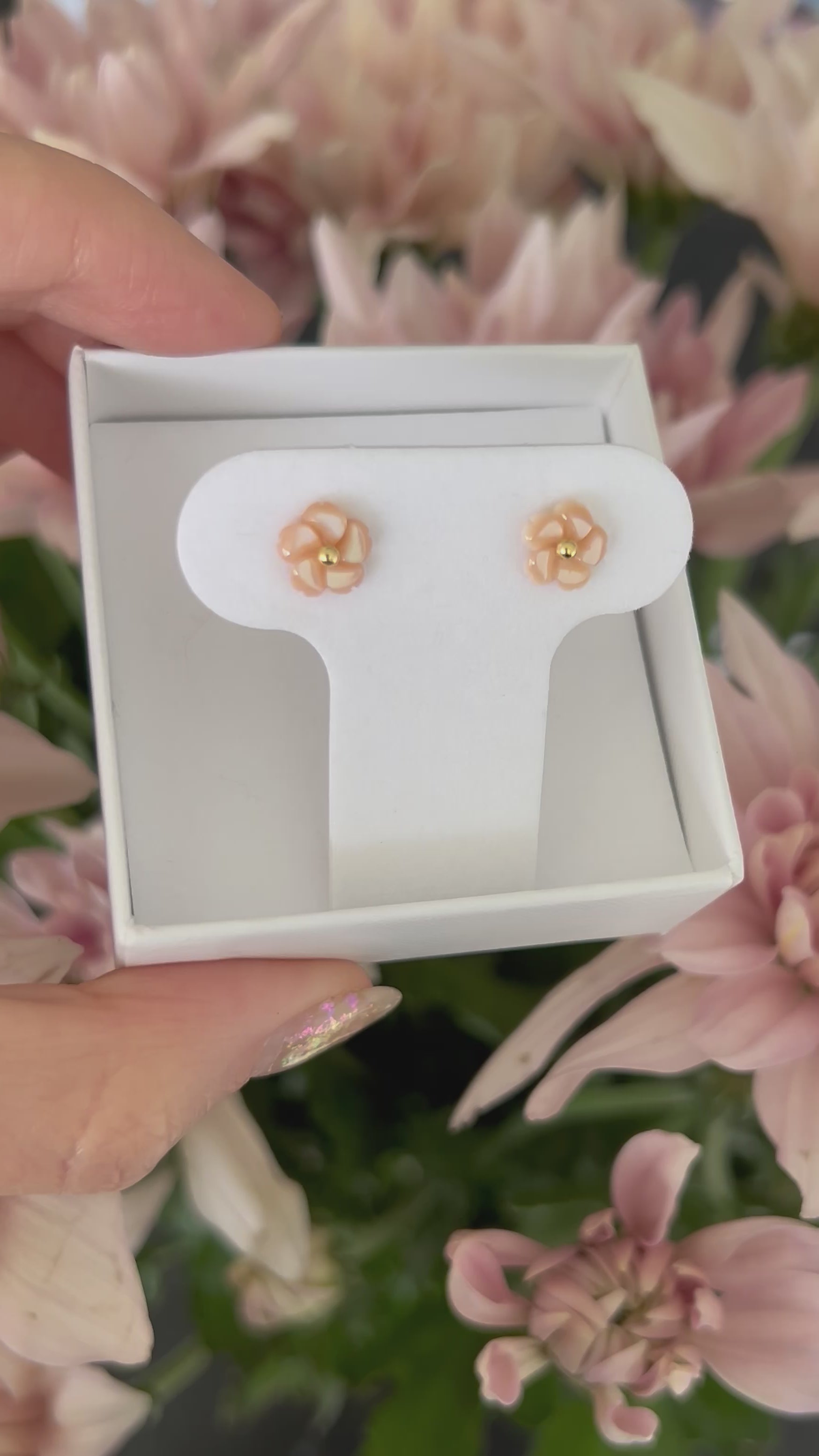Broqueles de oro de 18k de flor de madre perla rosa con centro de oro