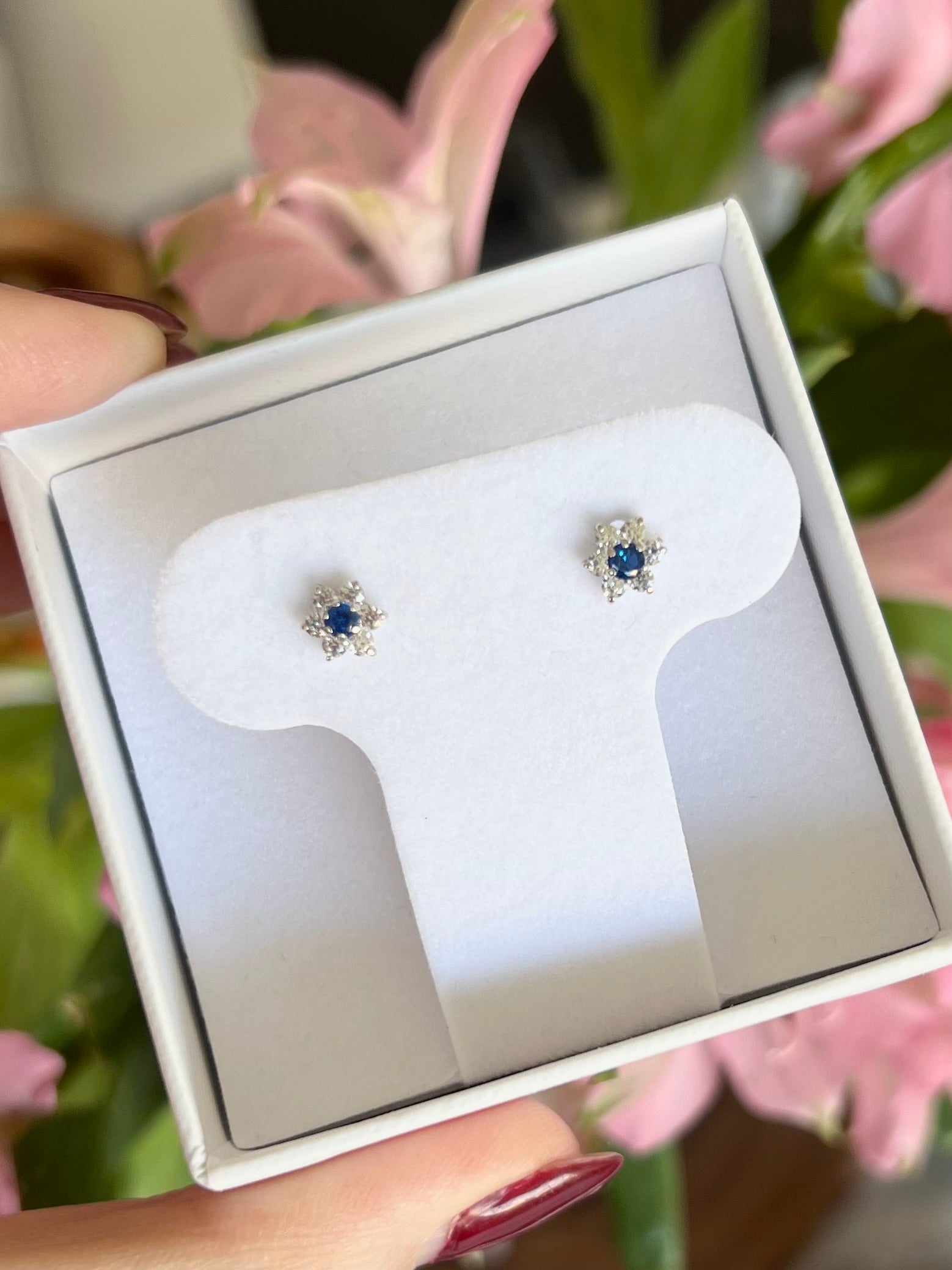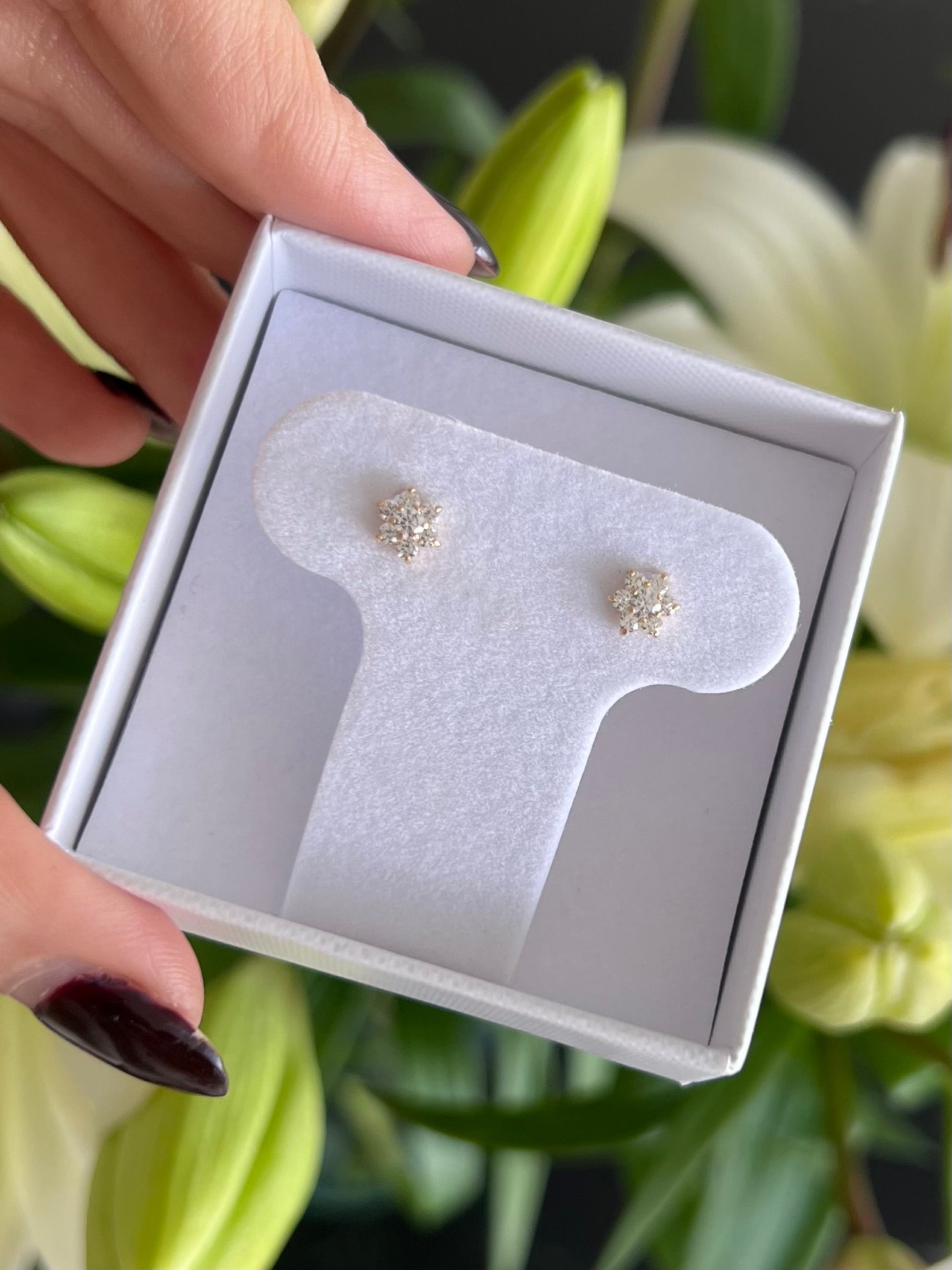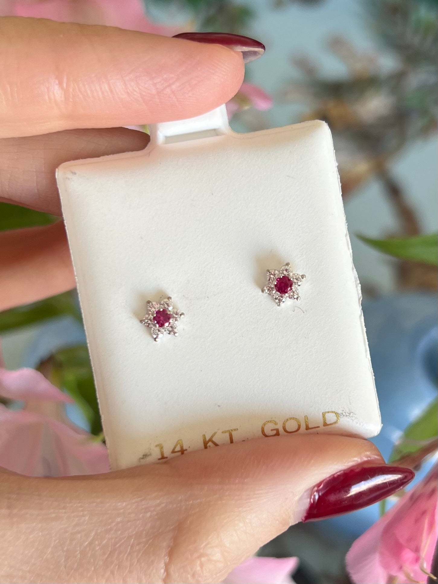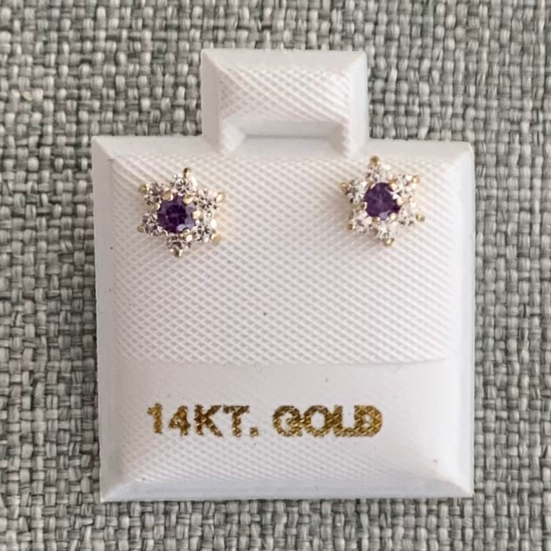 Broqueles en oro de 14k de flor de zirconias con centro de zirconia de color