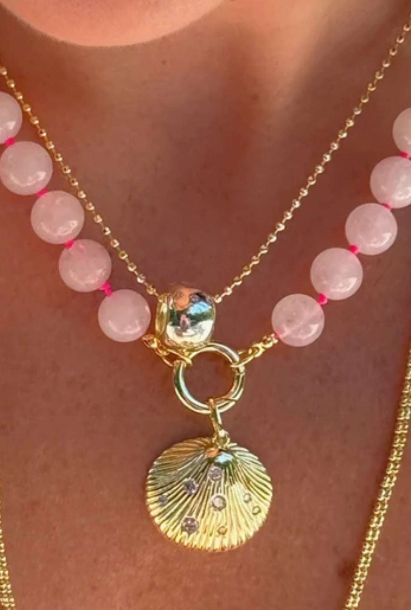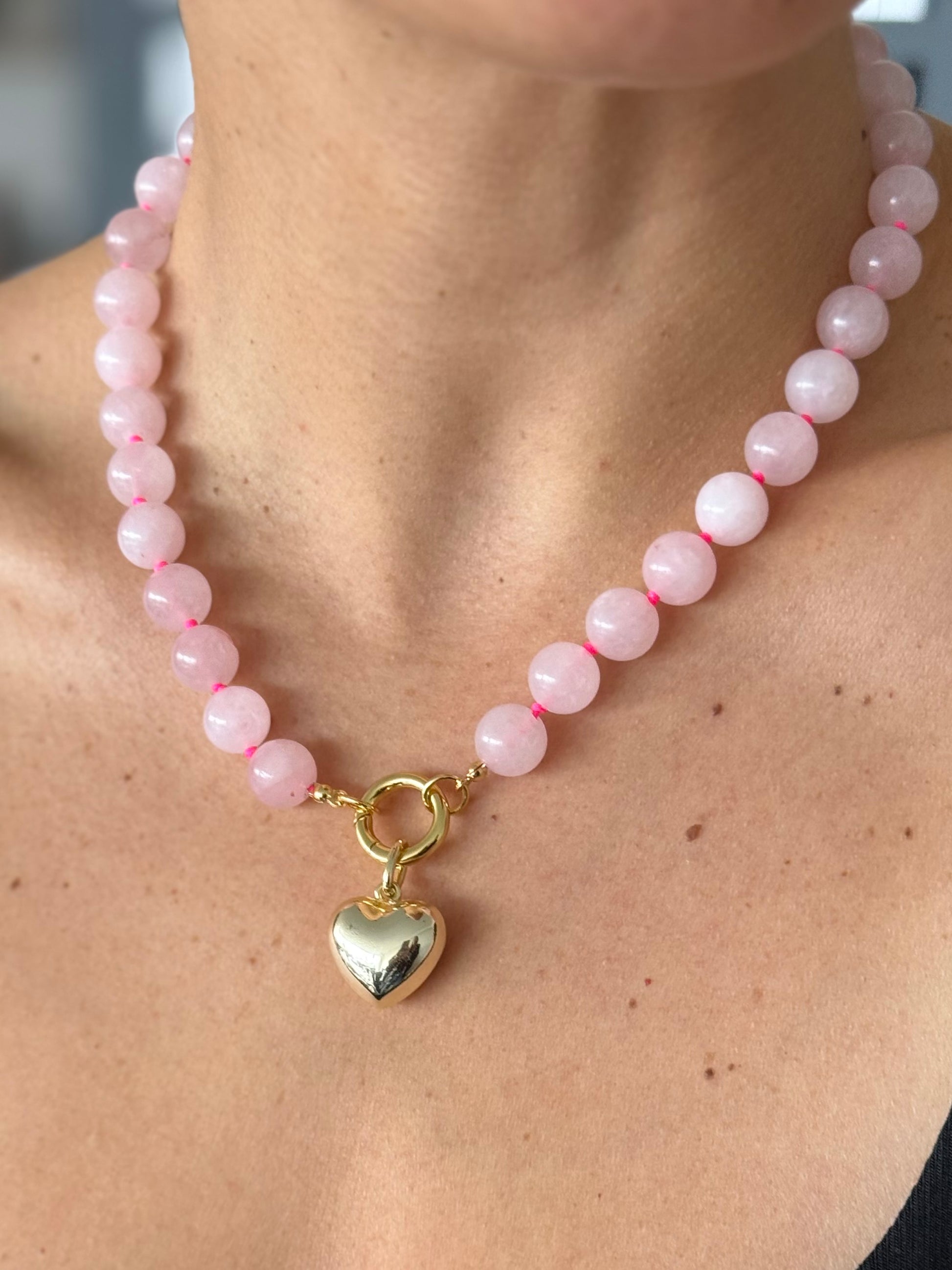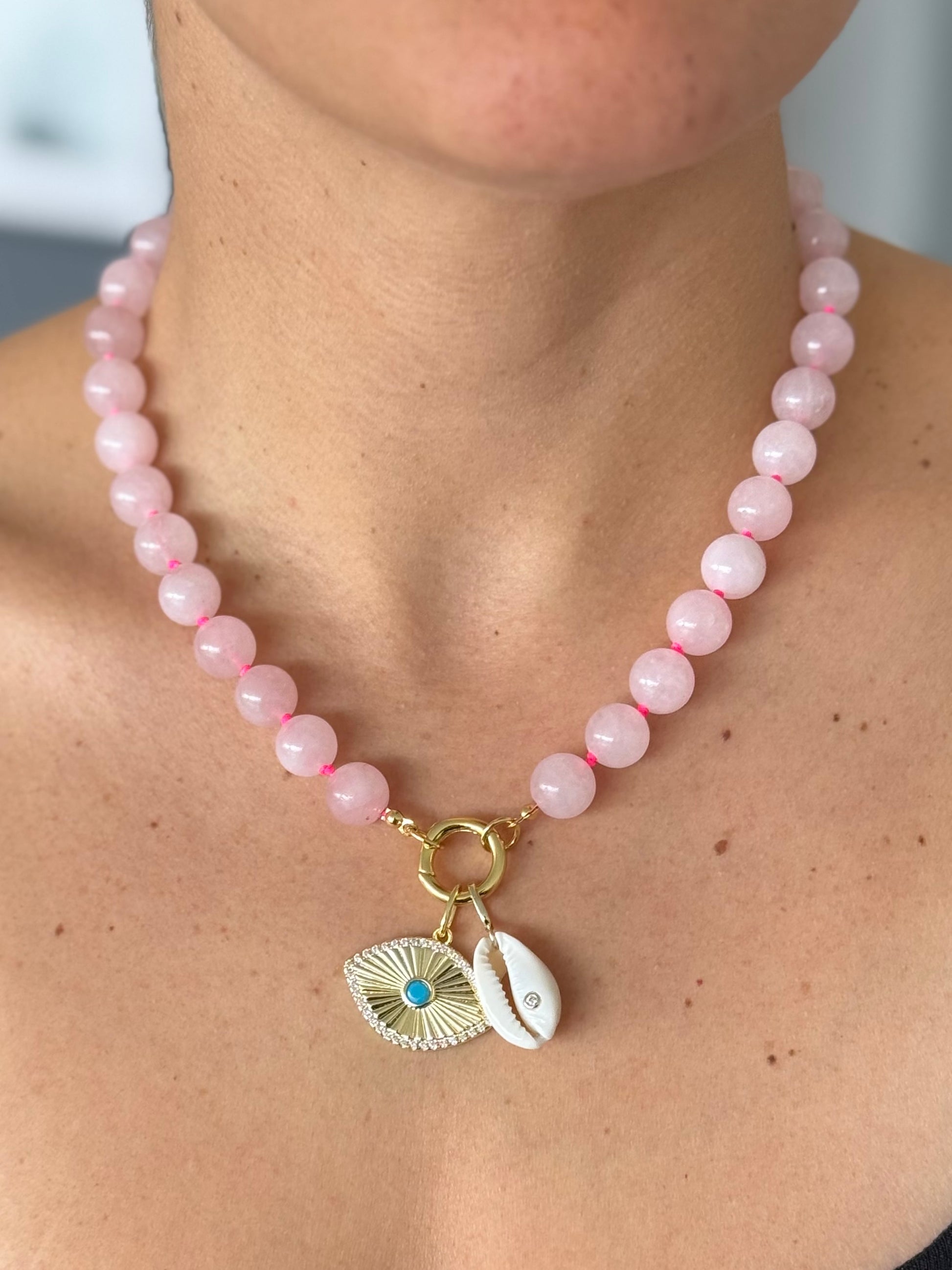 Collar de hilo hot pink y piedras naturales color rosa claro, con broche de baño de oro de 18k. Agrega tus charms favoritos
