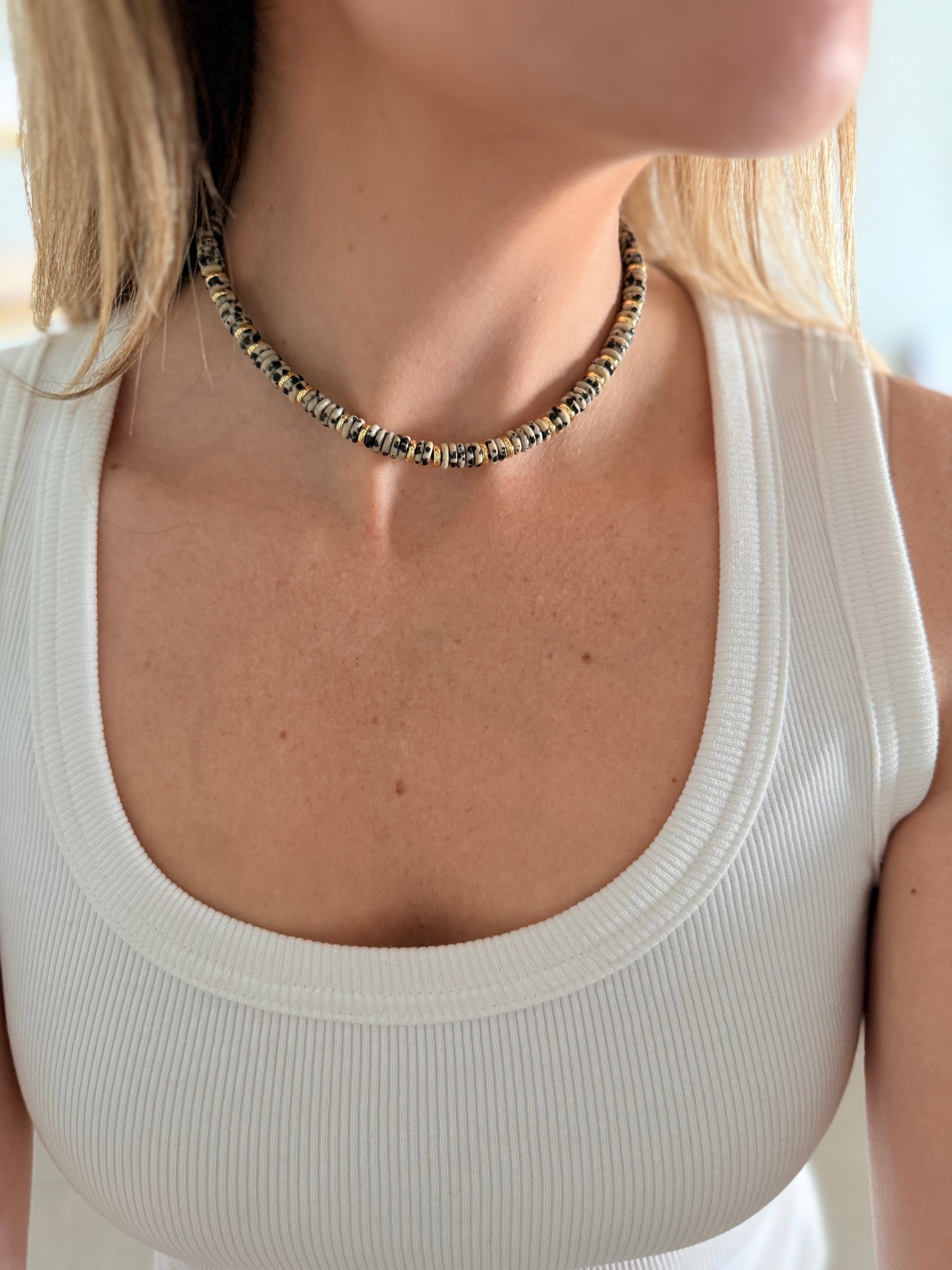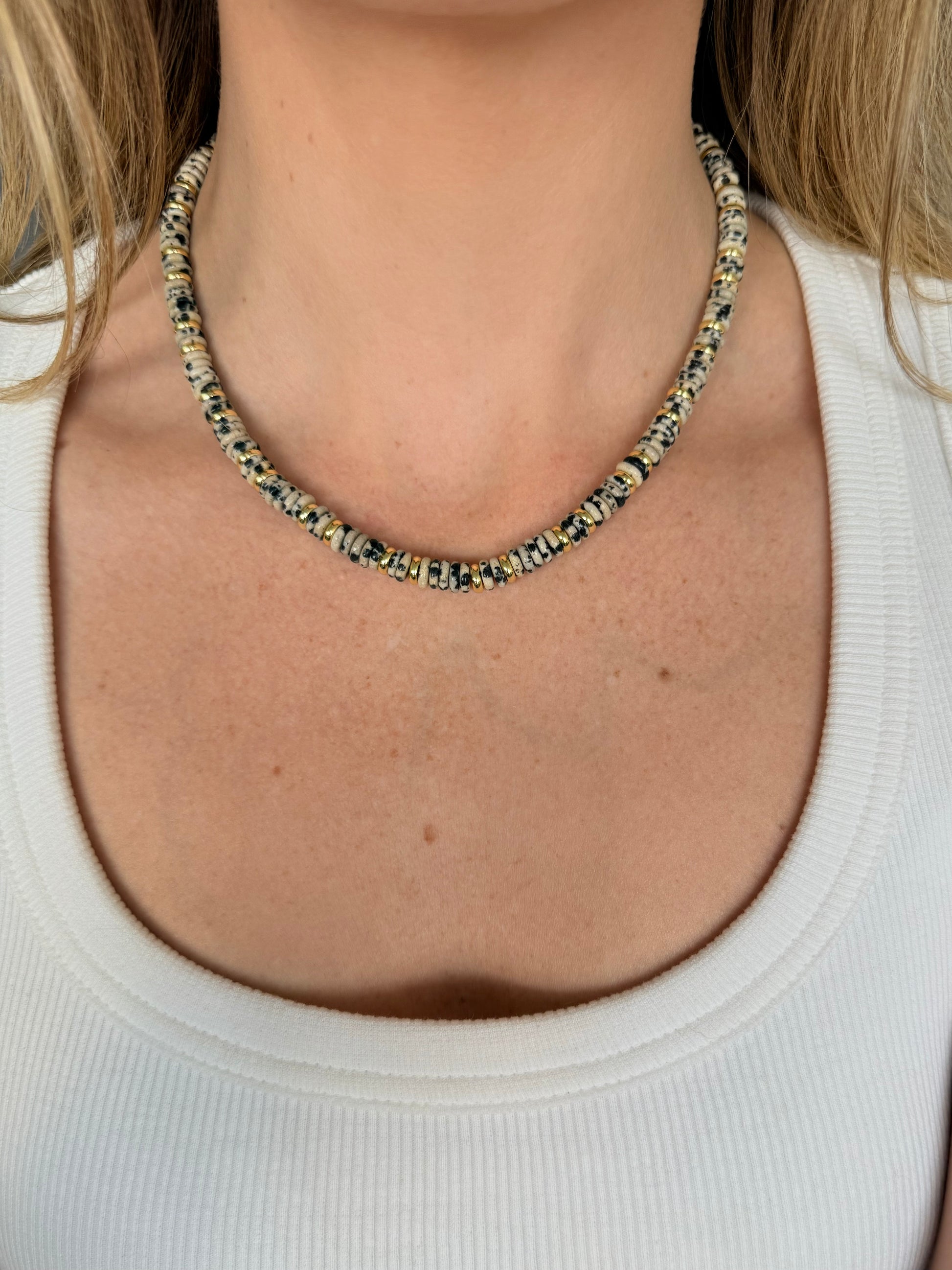 Collar pukka con piedras jaspe dálmata y discos con baño de oro 18k