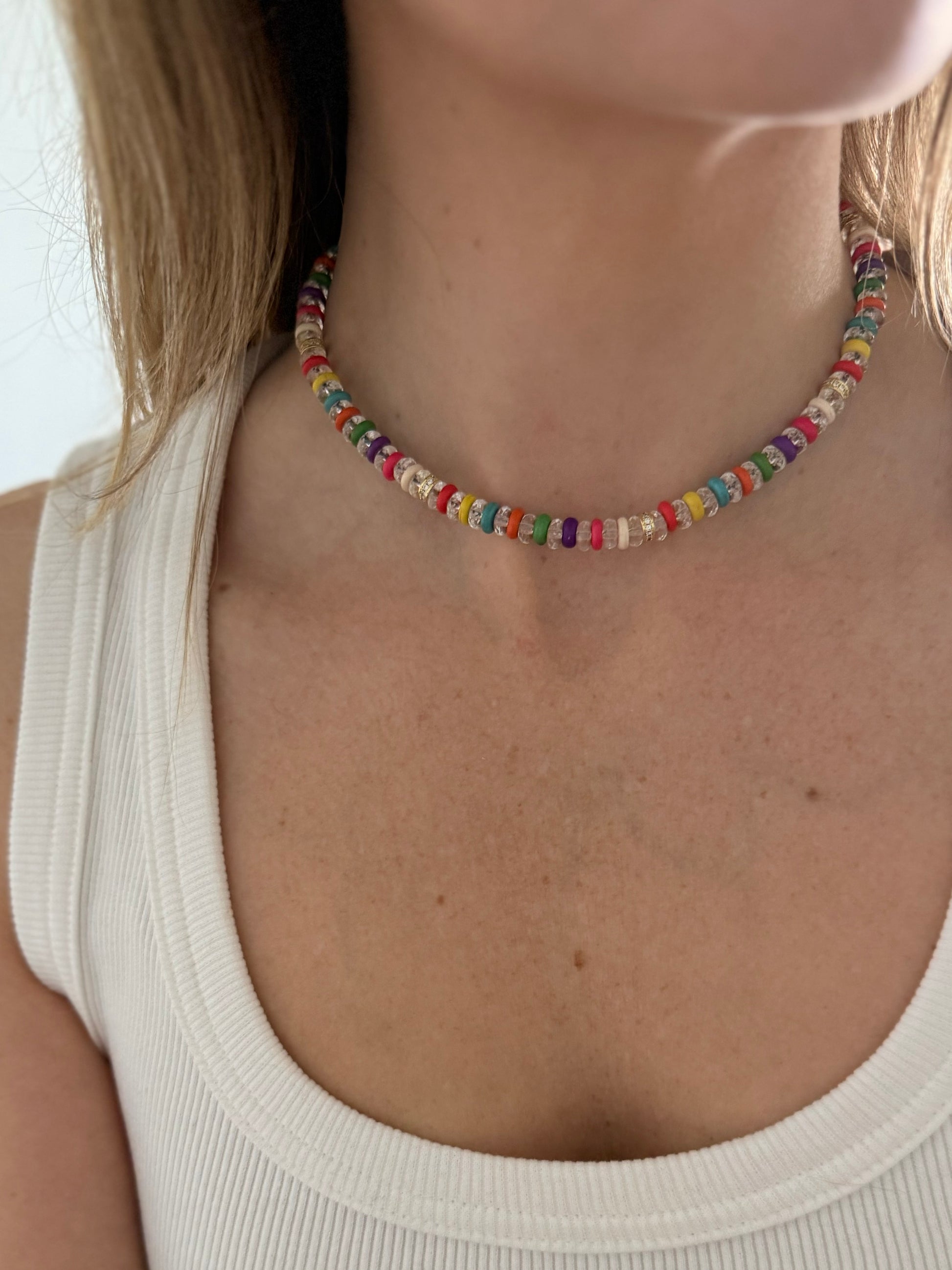Collar pukka con piedras de colores y discos con baño de oro 18k con zirconias