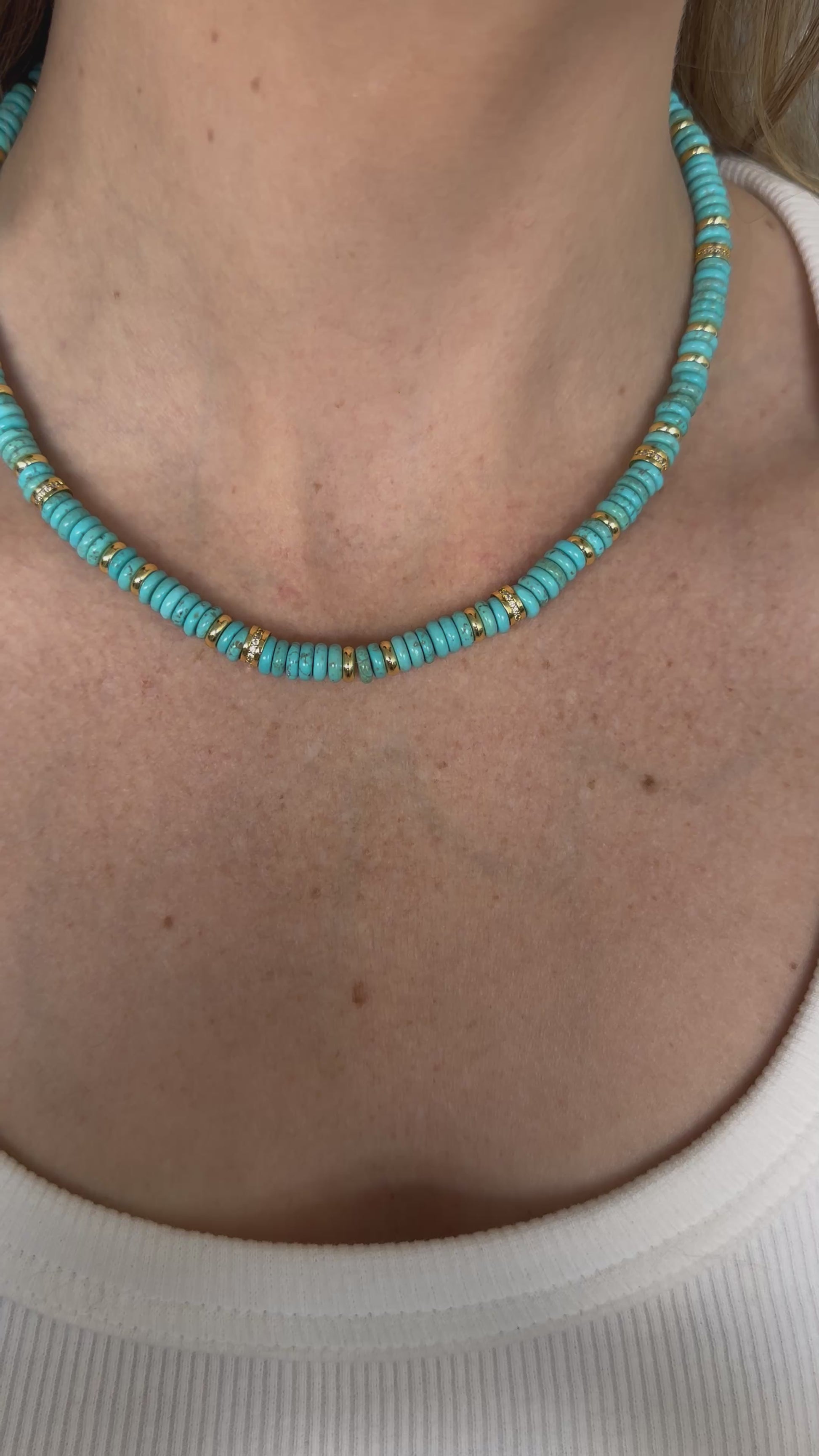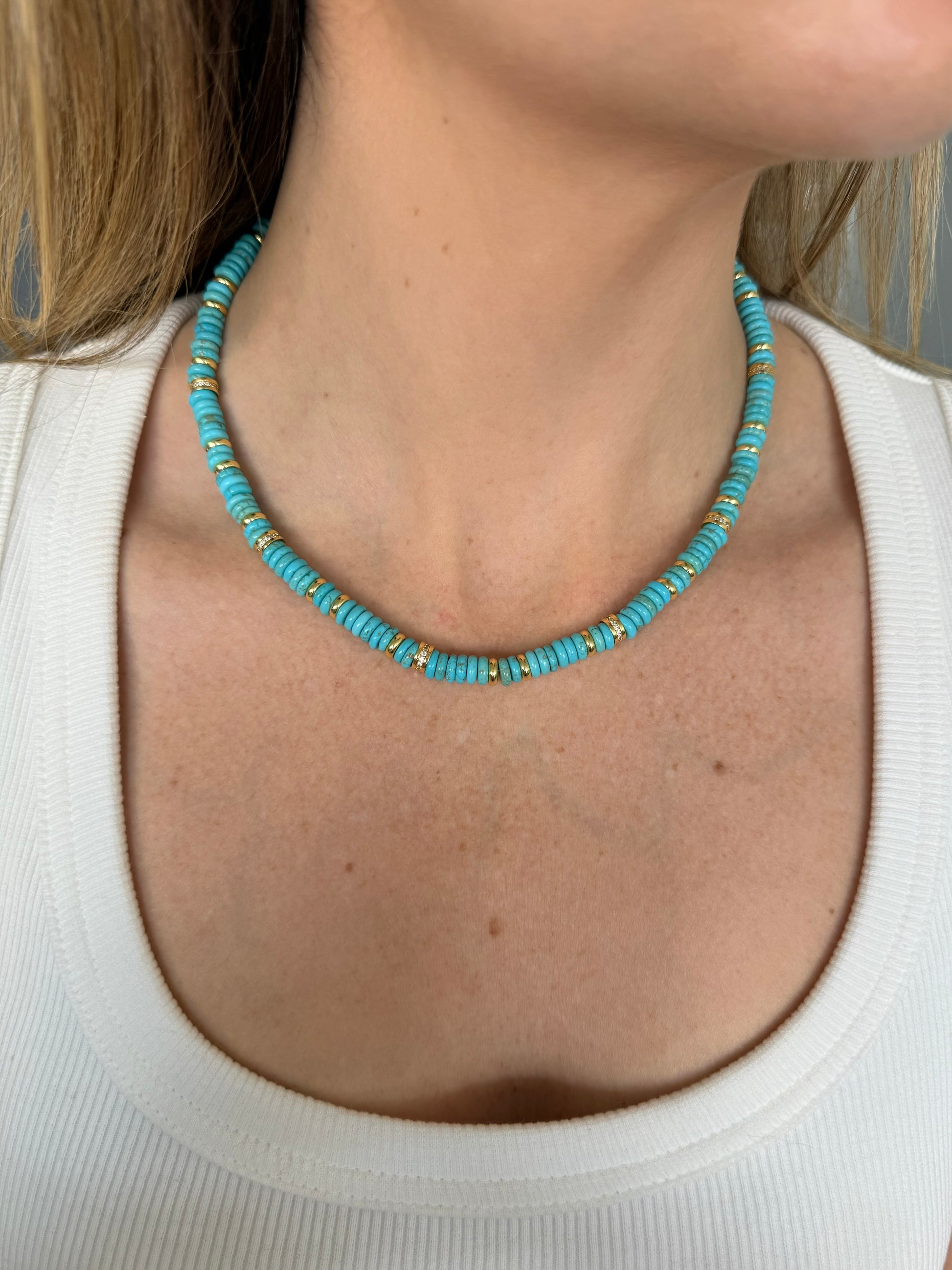 Collar pukka con piedras color turquesa y discos con baño de oro 18k con zirconias
