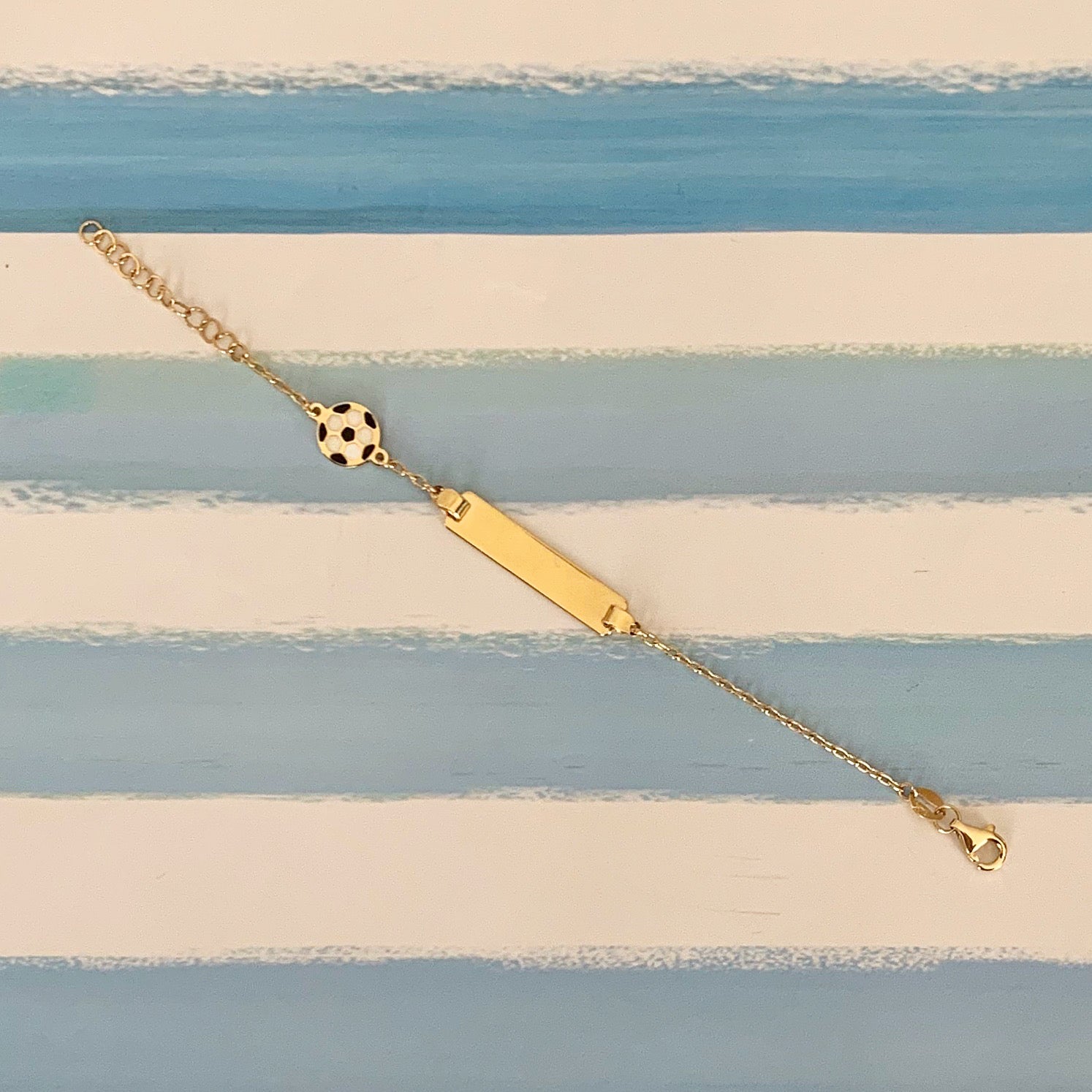 Esclava en oro de 14k con placa grabable de 2.5cm y balón de fútbol esmaltado