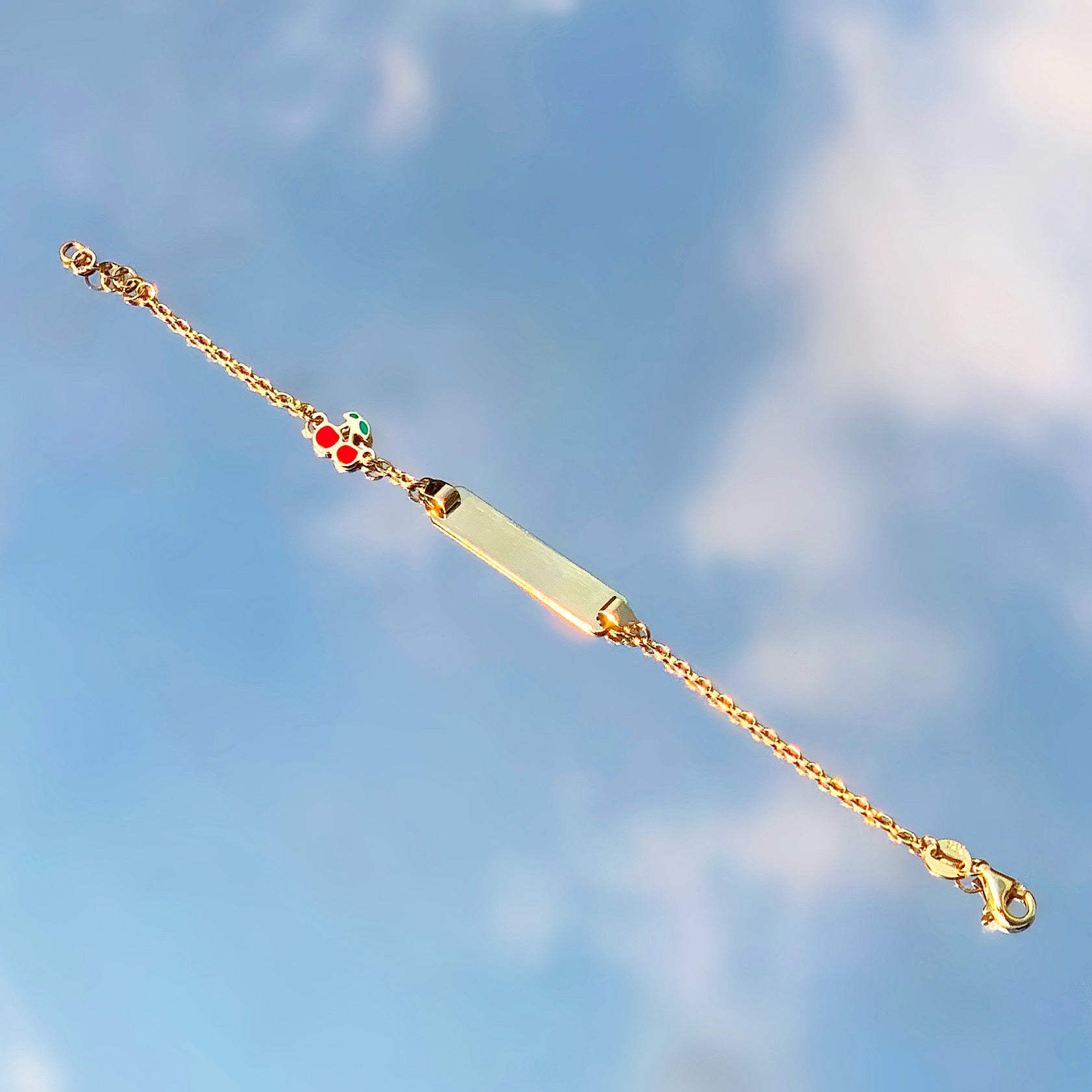Esclava en oro de 14k con placa grabable y cereza esmaltada