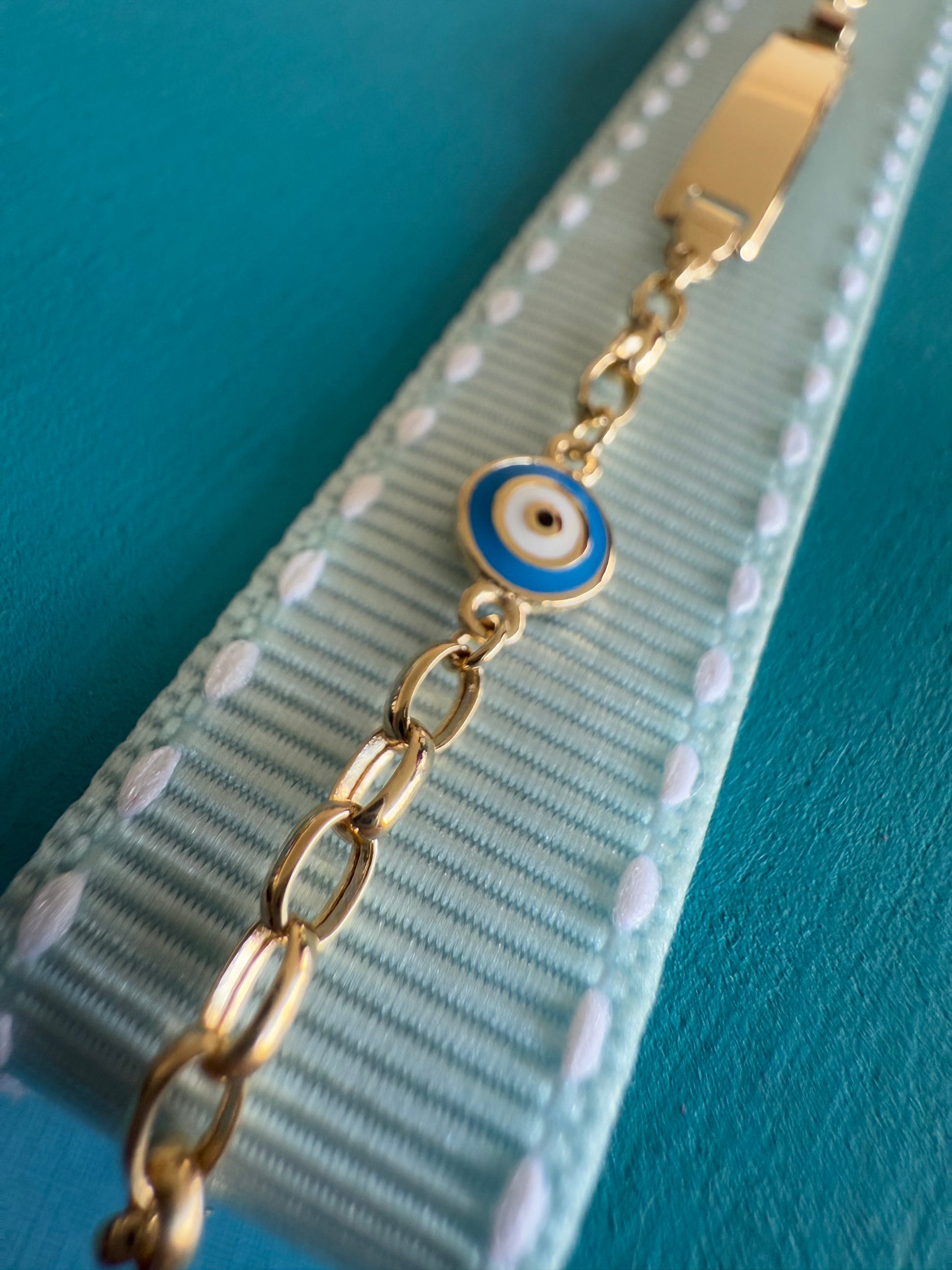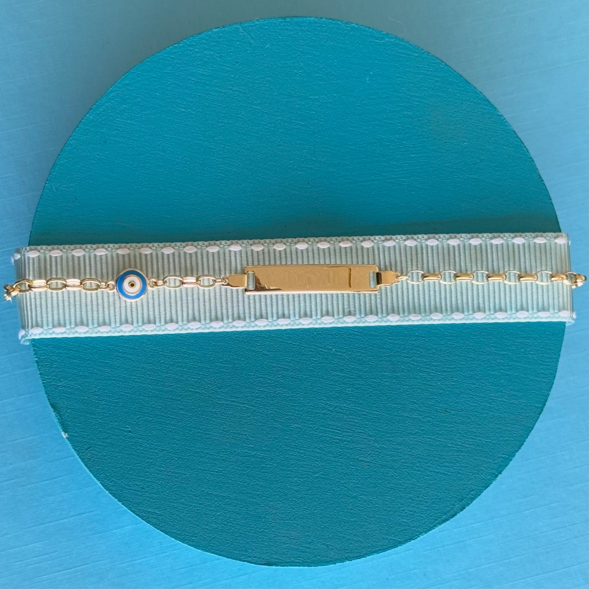 Esclava de oro de 14k con cadena link y ojo turco esmaltado