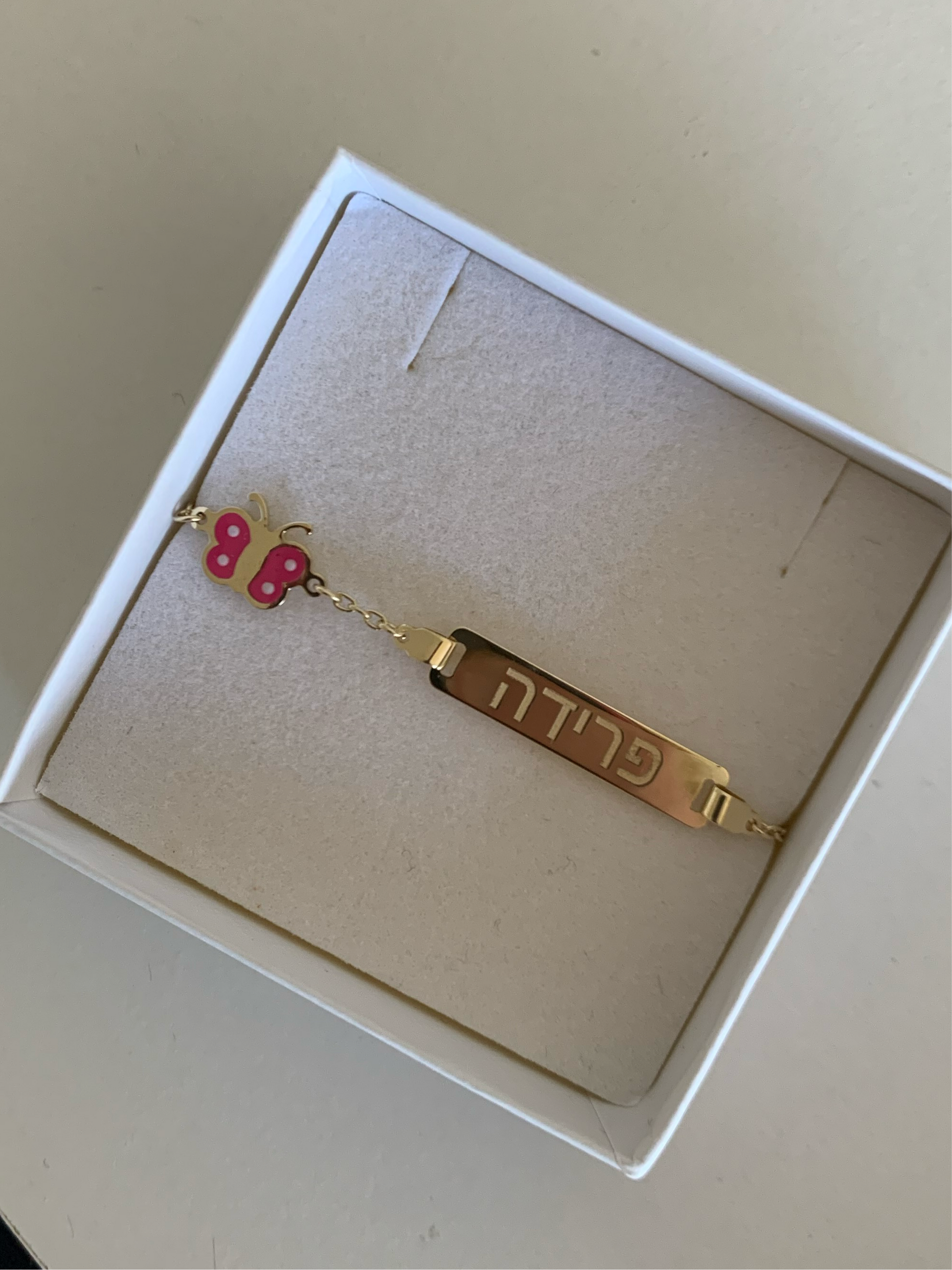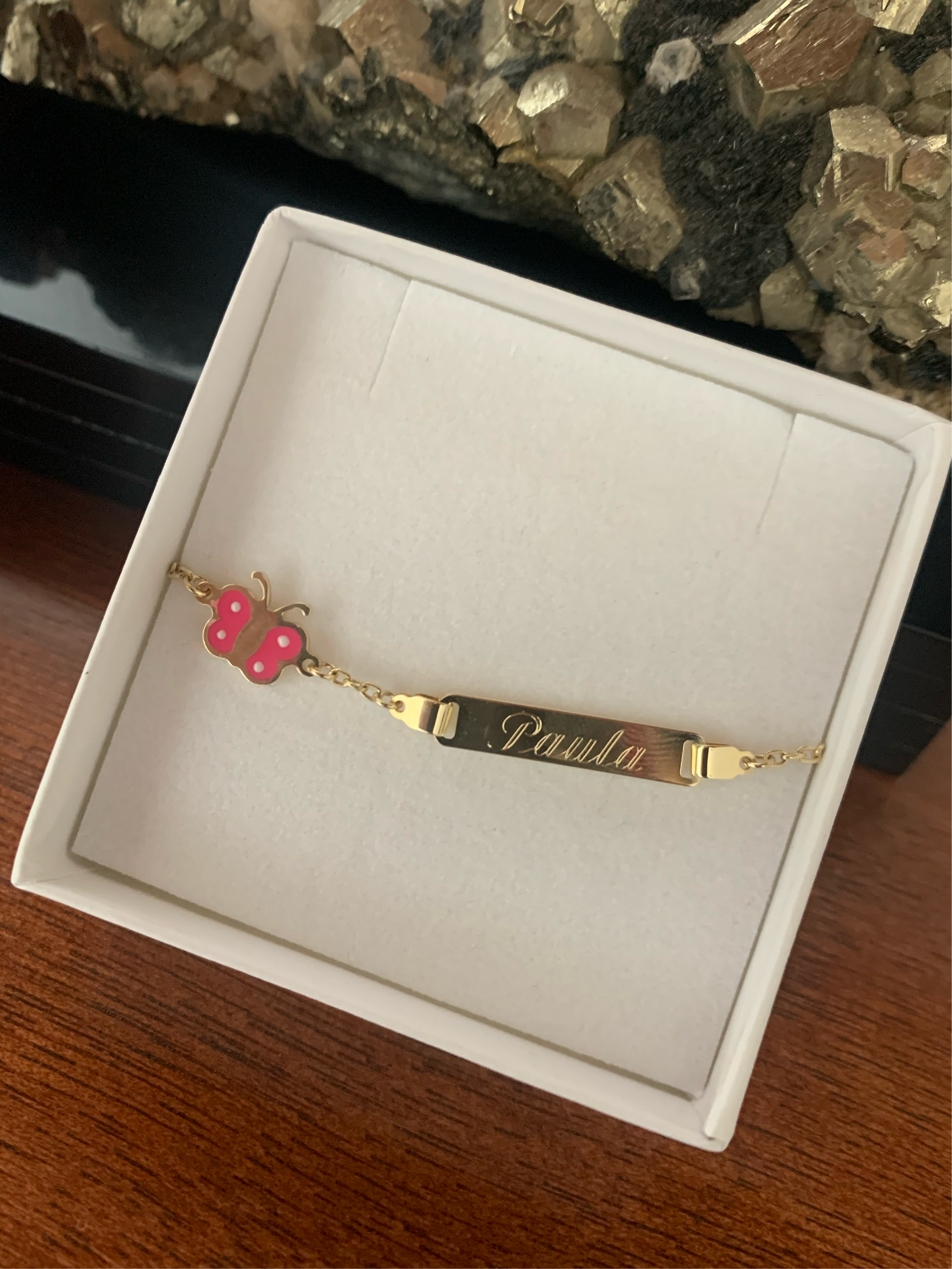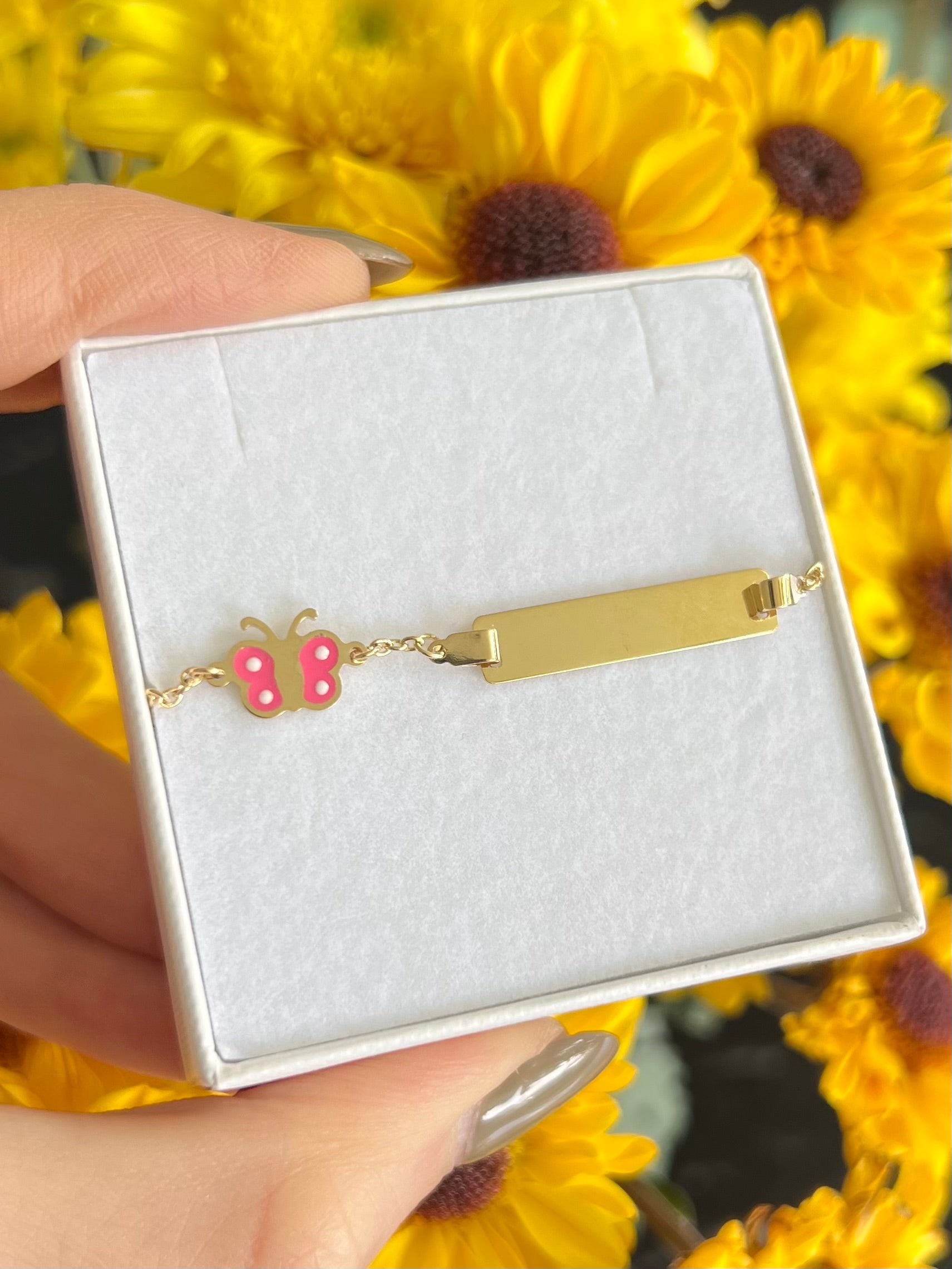 Esclava en oro de 14k con placa grabable y mariposa esmaltada