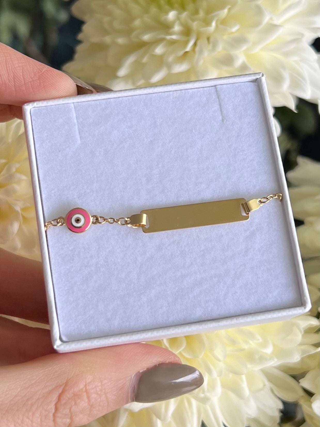 Esclava en oro de 14k con ojo turco esmaltado y placa grabable