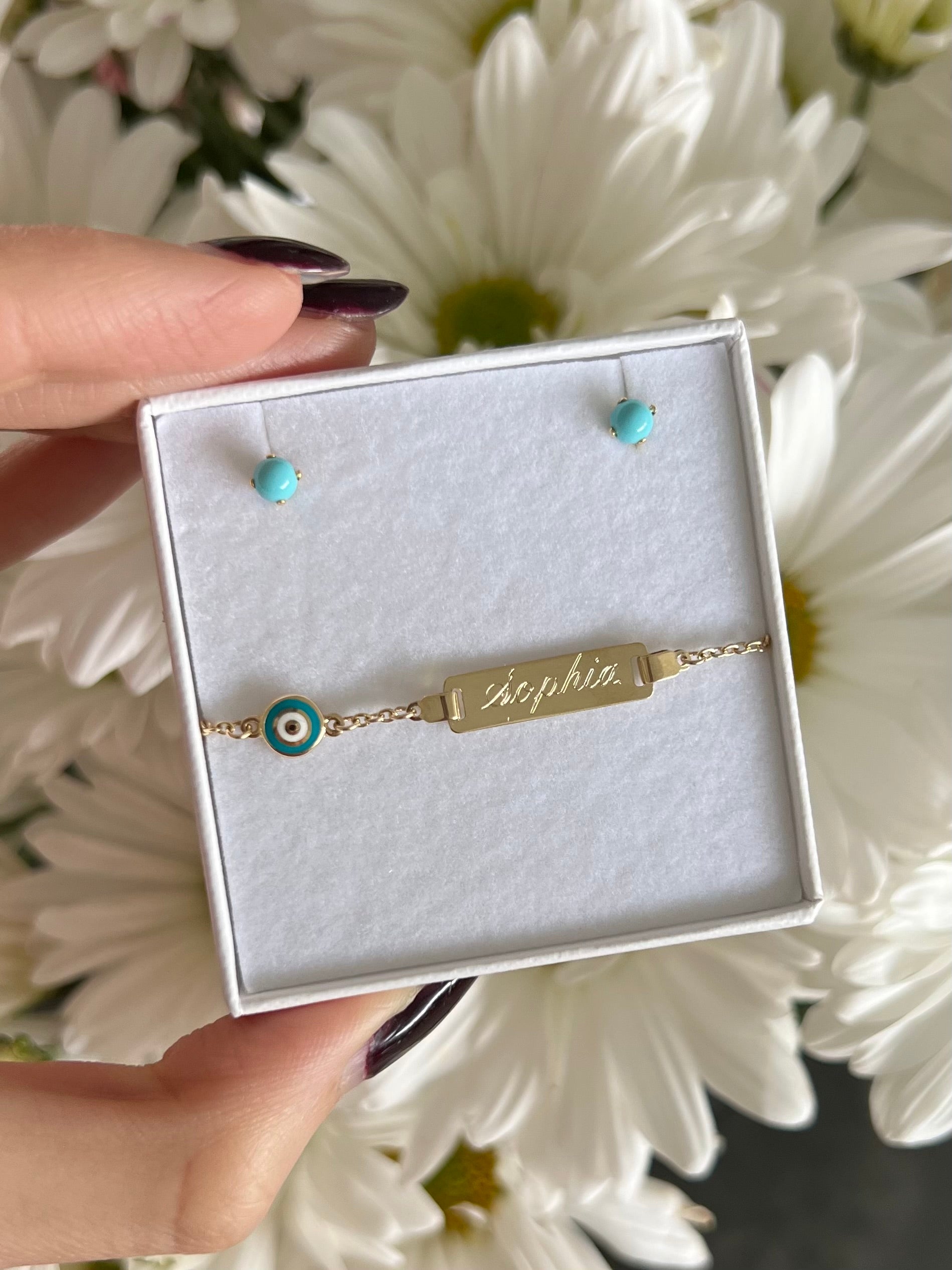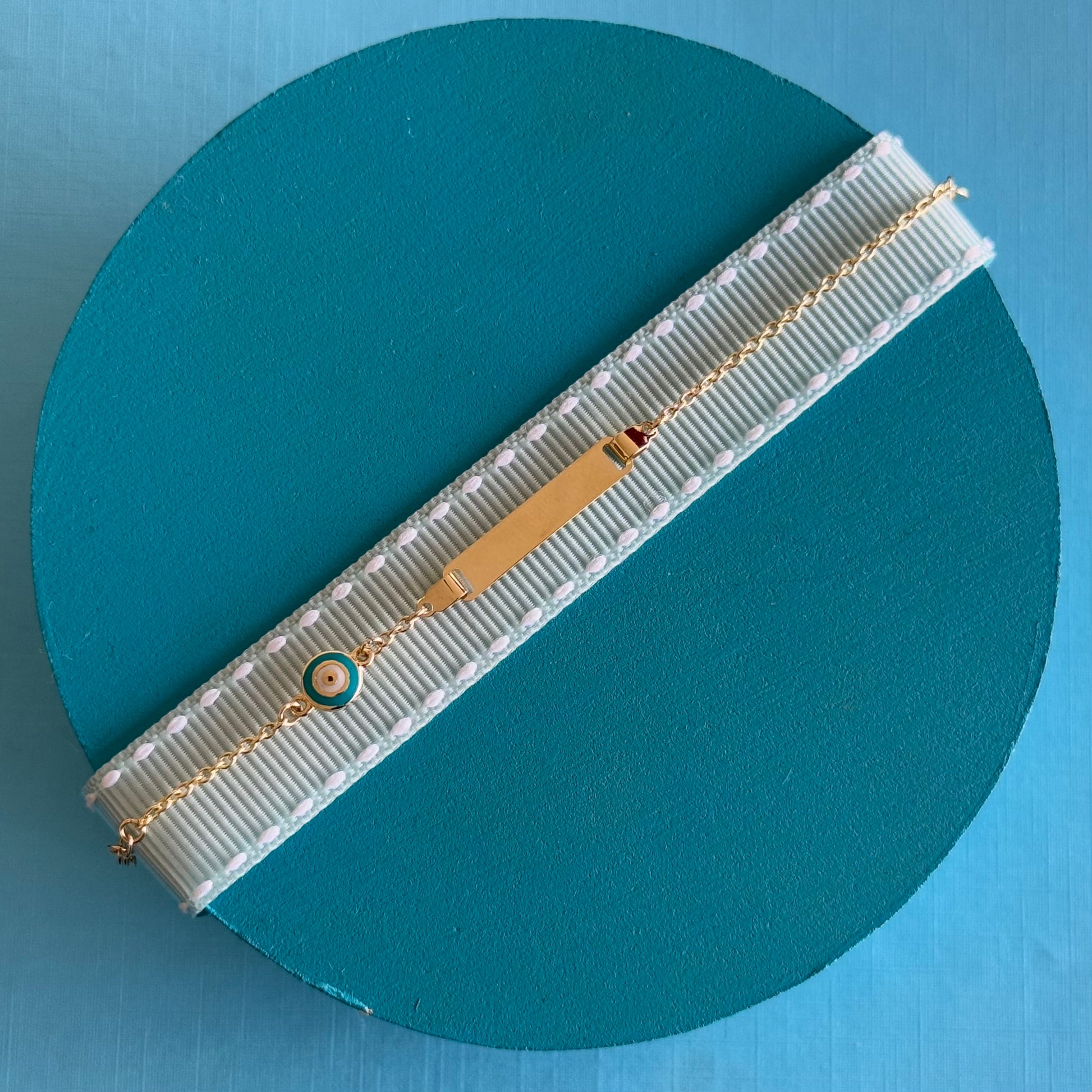 Esclava en oro de 14k con placa grabable y ojo turco esmaltado color turquesa