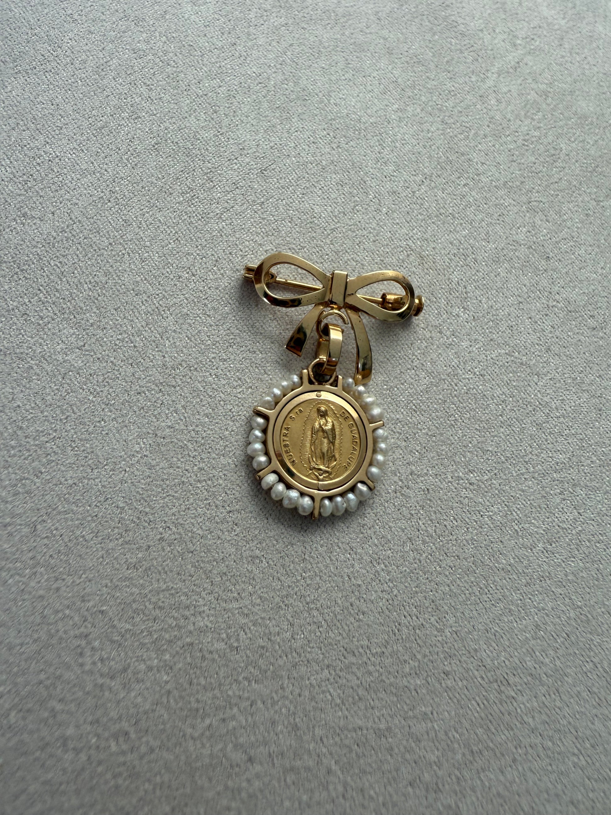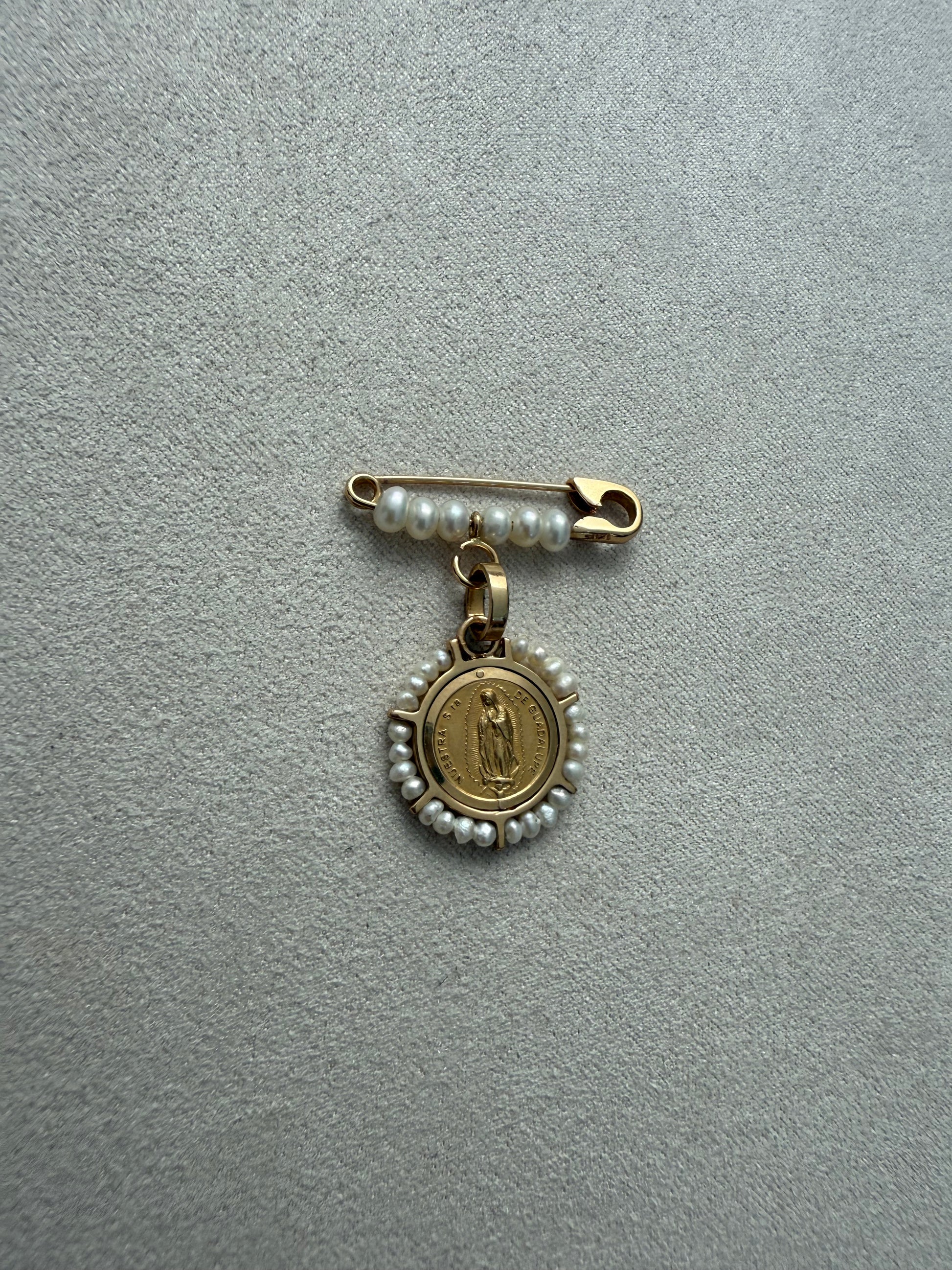 Medalla de oro de 14k con una Virgen de Guadalupe grabada y perlas naturales