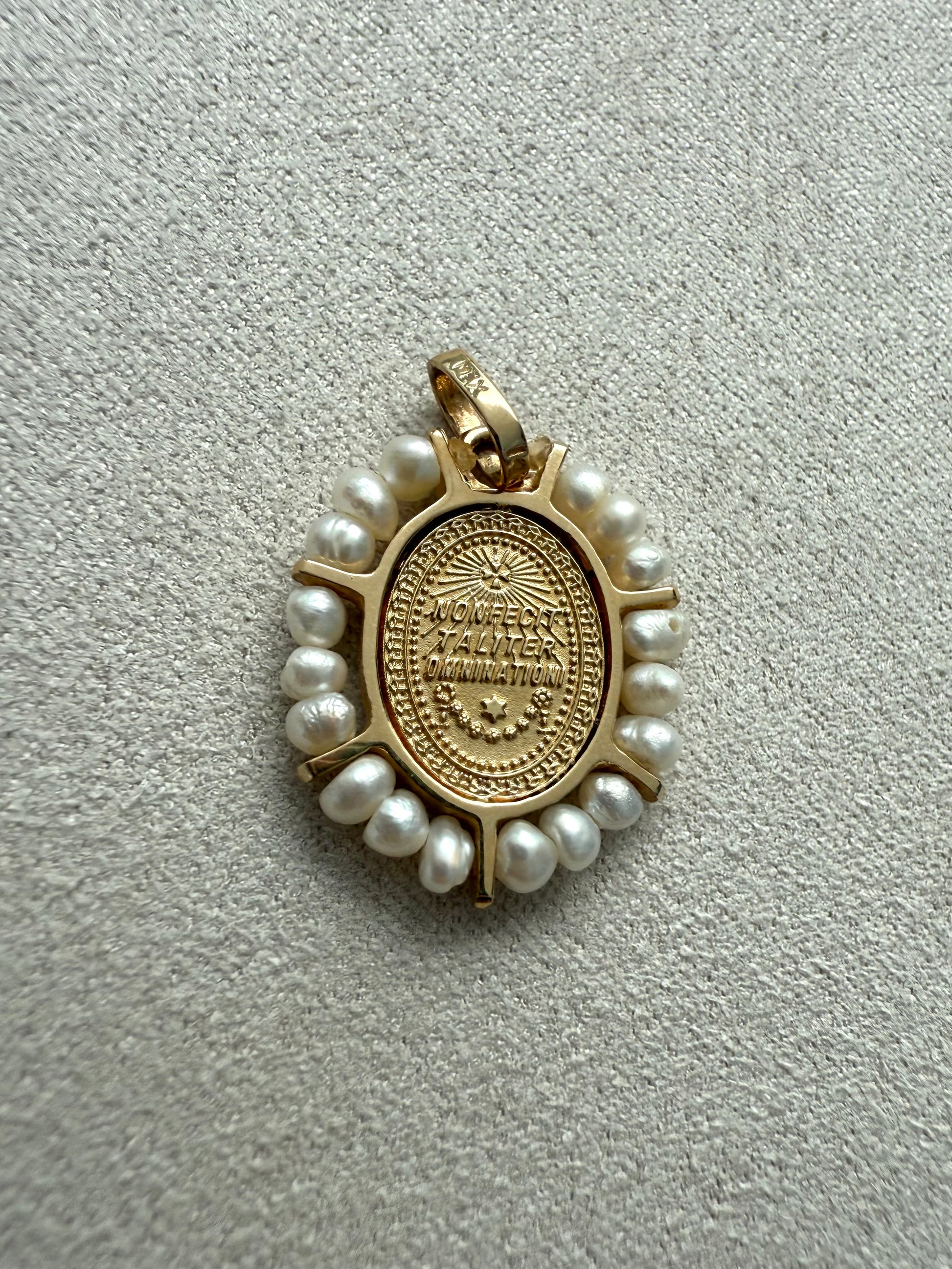 Medalla ovalada de oro de 14k de virgen tallada en oro de 14k con perlas naturales cultivadas