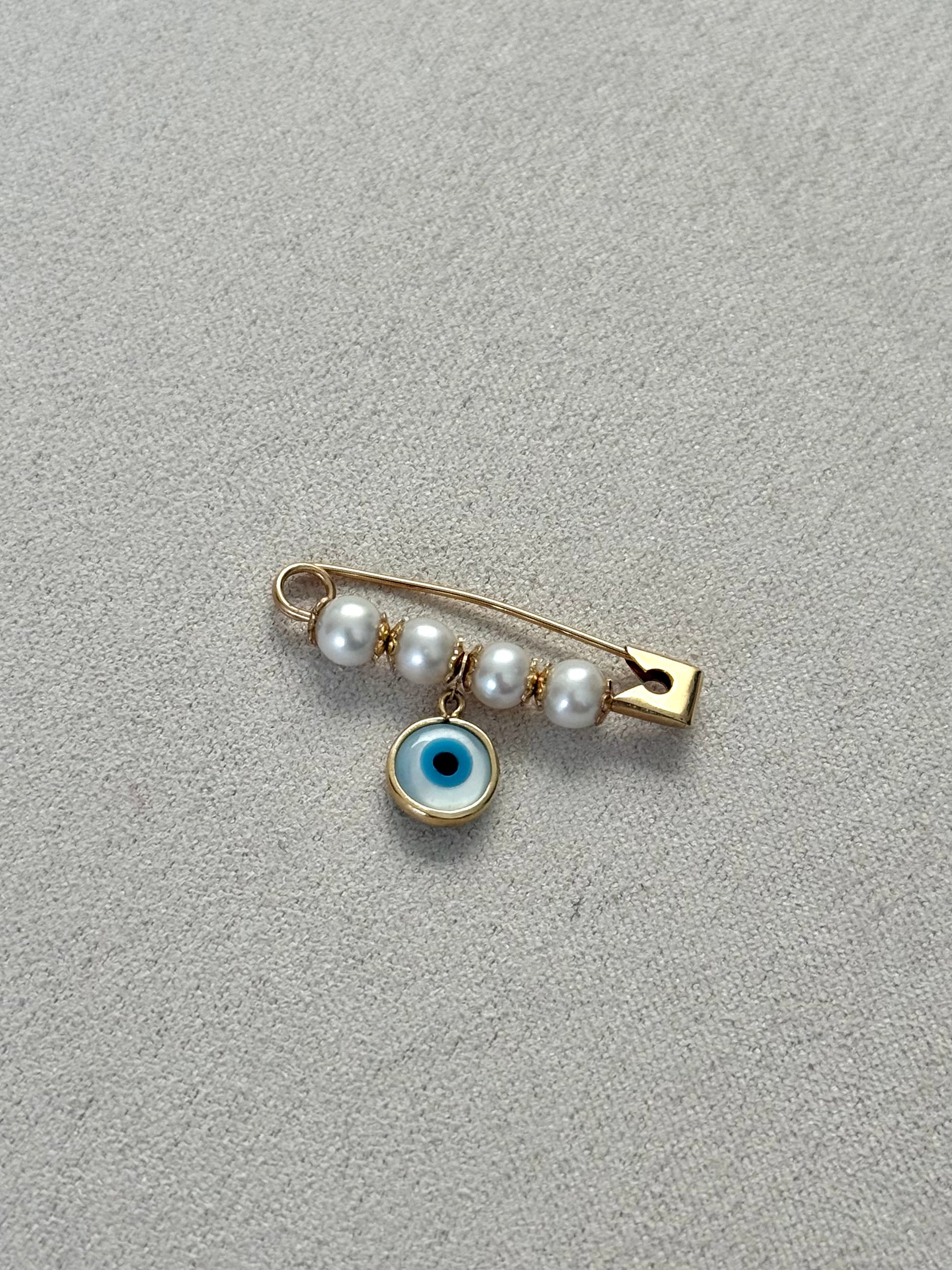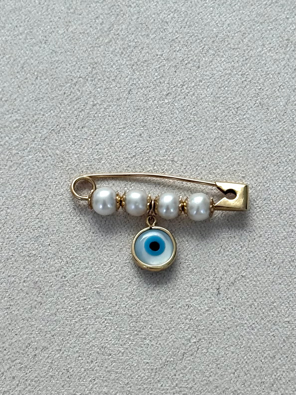 Pin/ segurito de oro de 14k con ojo turco de madre perla y perlas naturales cultivadas