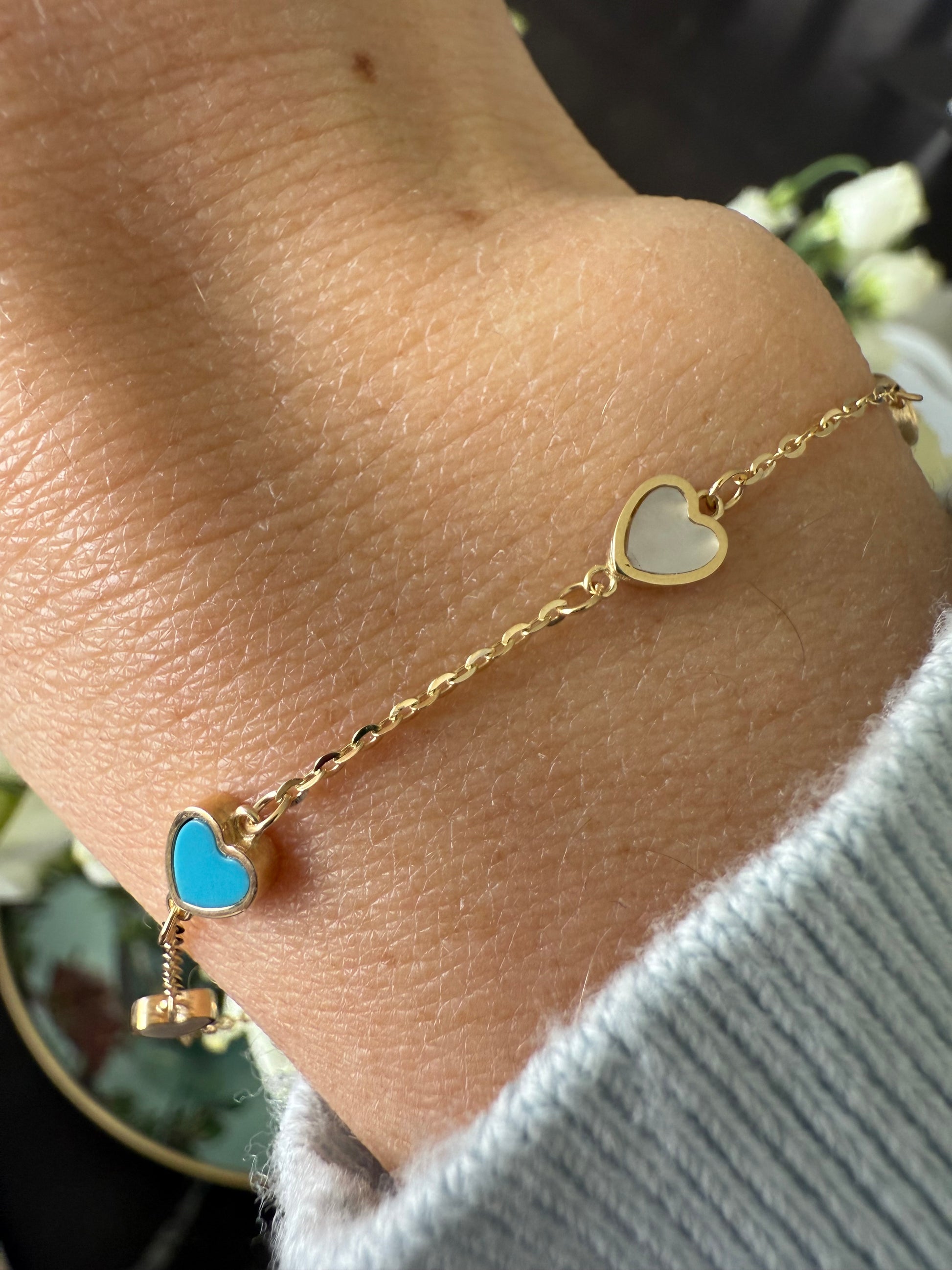 Pulsera de oro de 14k con tres corazones de madre perla y 2 turquesa