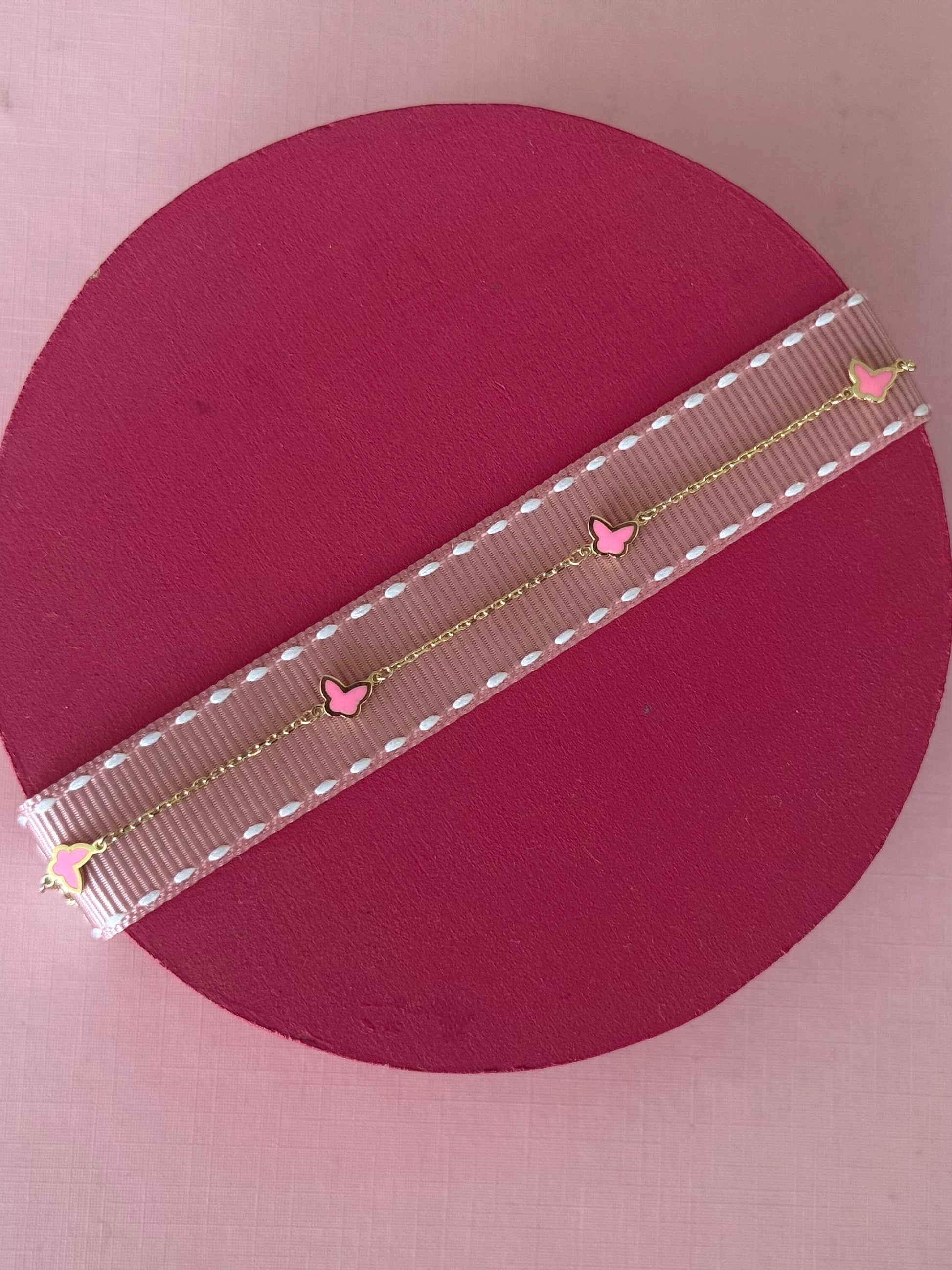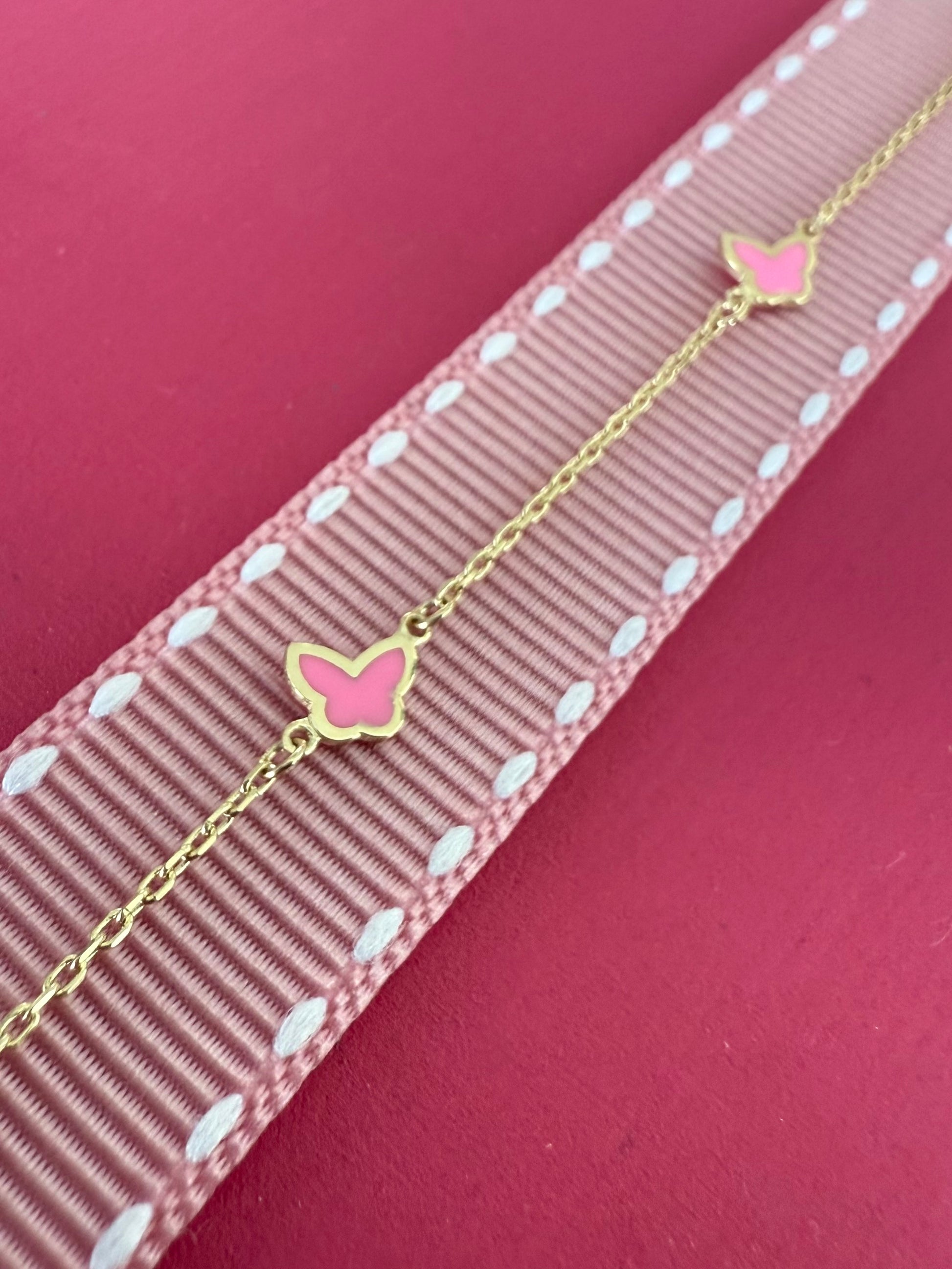 Pulsera de oro de 14k con cuatro mariposas esmaltadas rosas