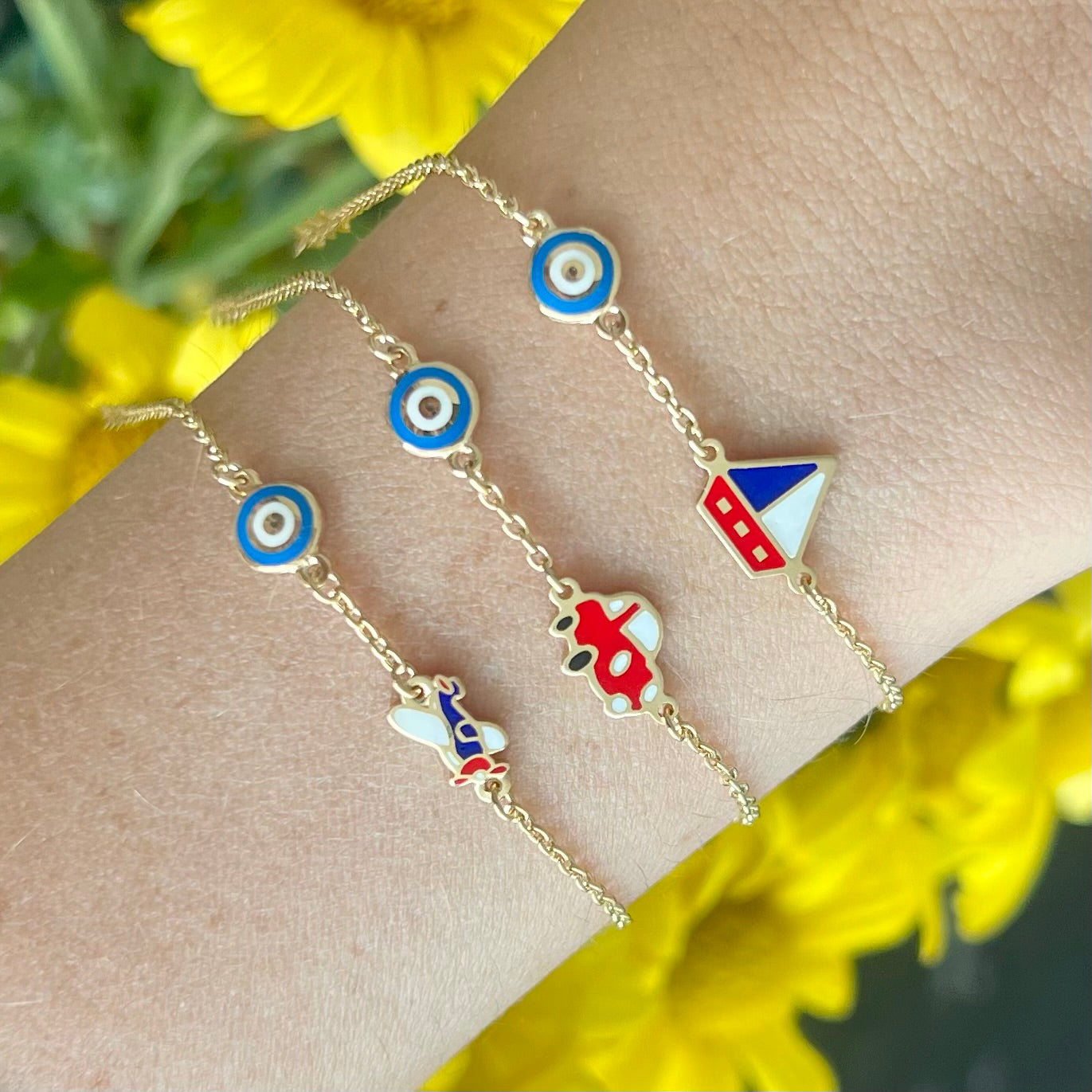 Pulsera en oro de 14k de ojo turco y avión esmaltados