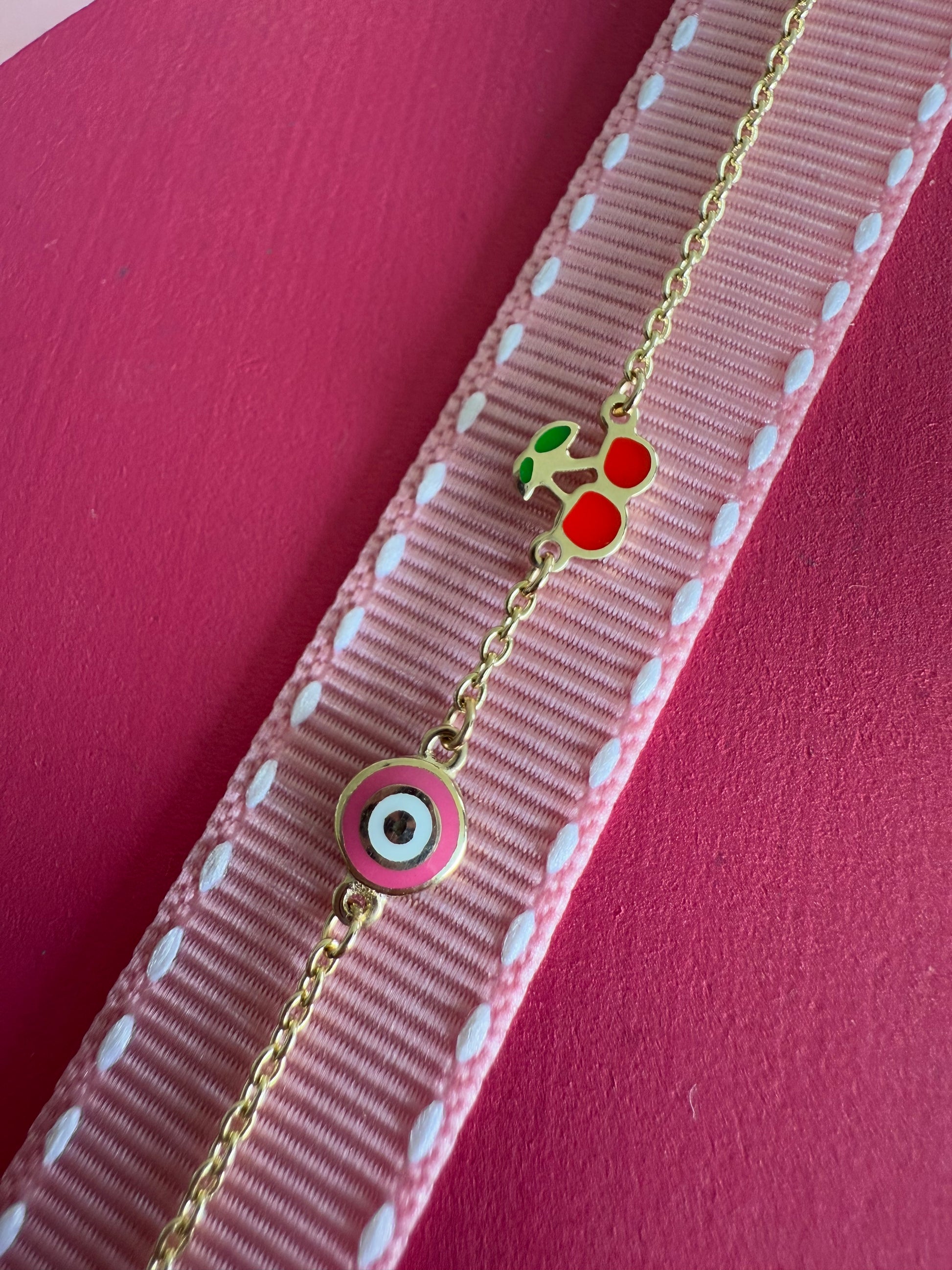 Pulsera de oro de 14k con ojo turco rosa y cerezas