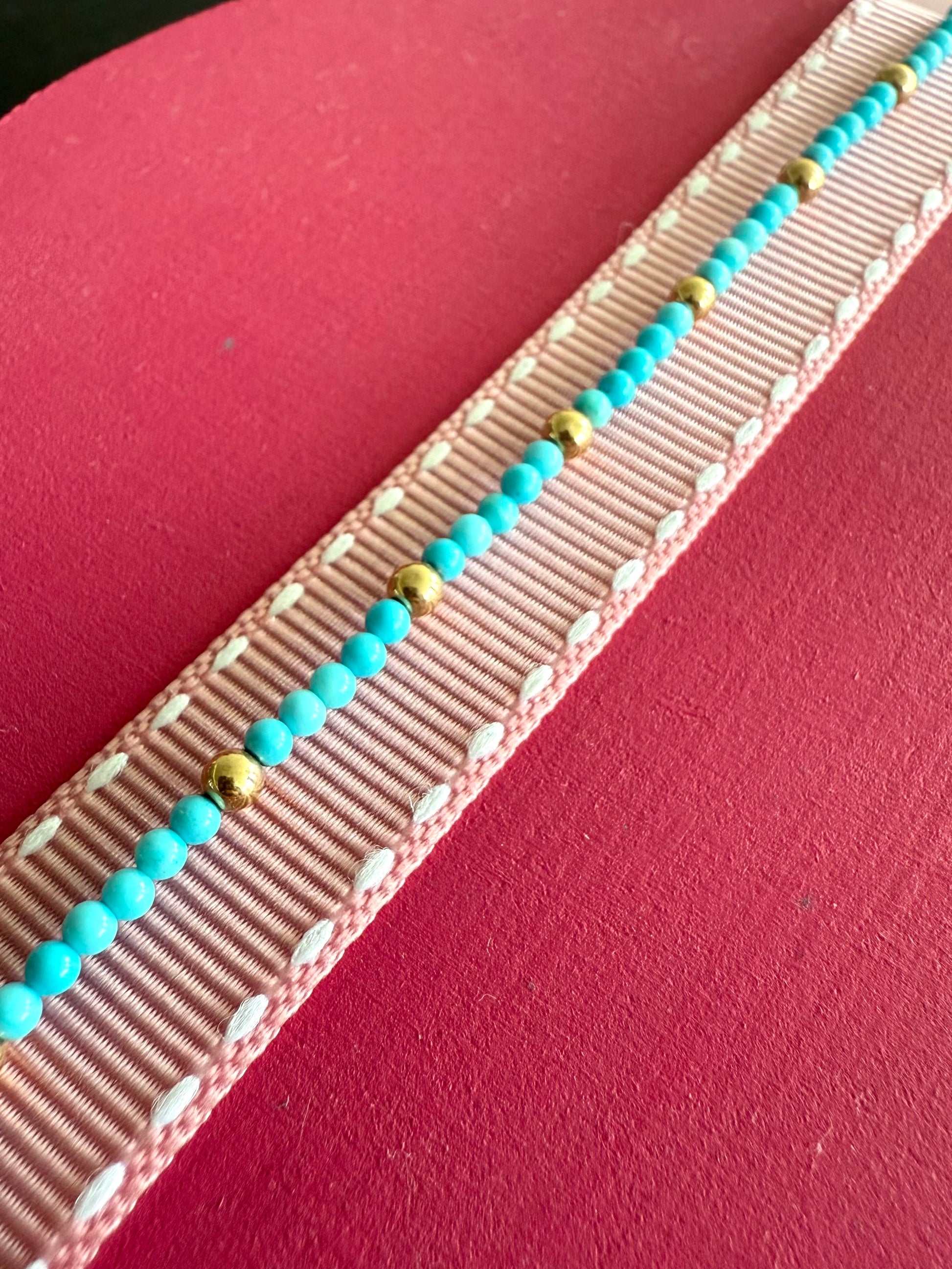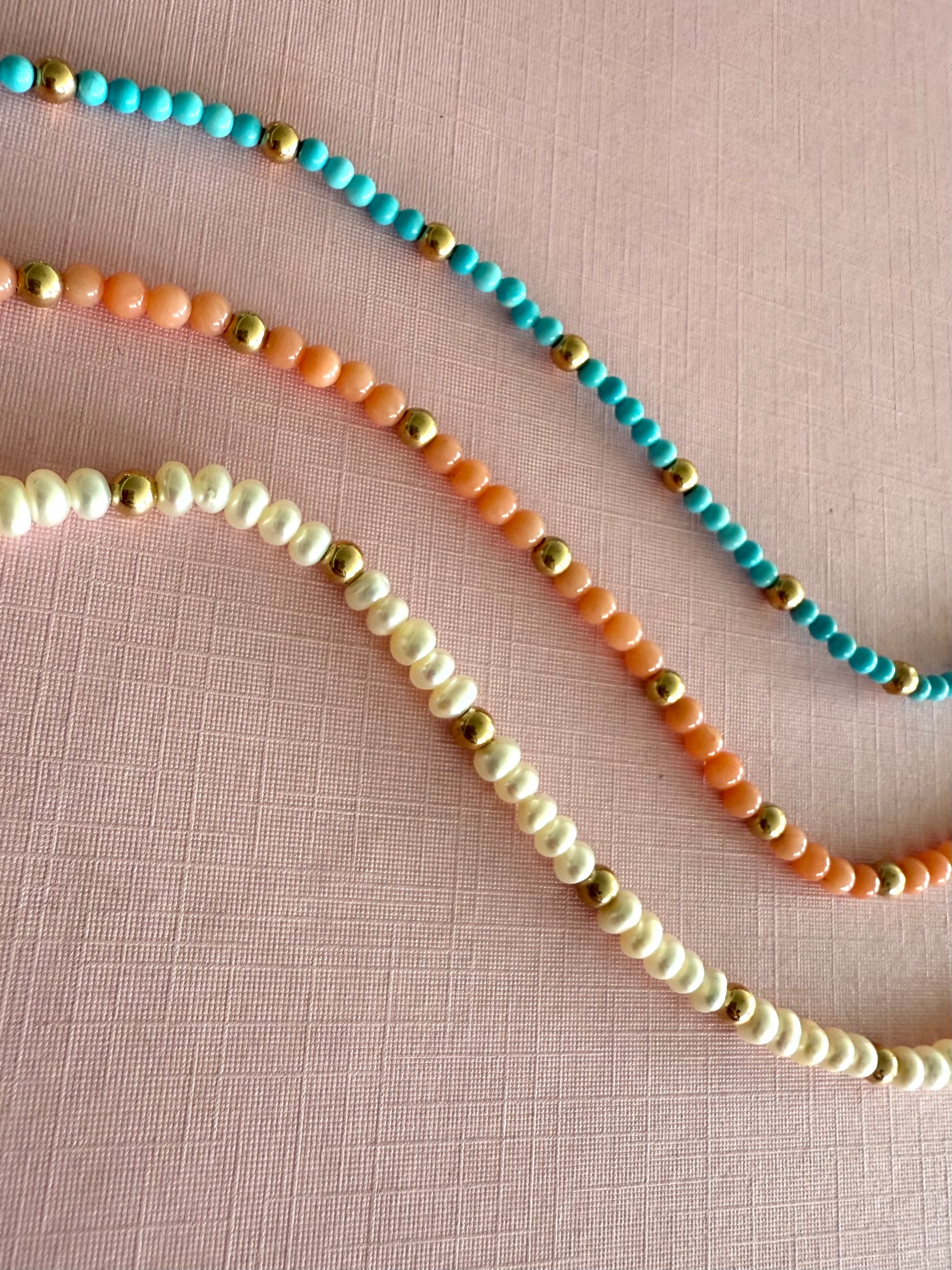 Pulsera de turquesas sintéticas y bolitas de oro de 14k
